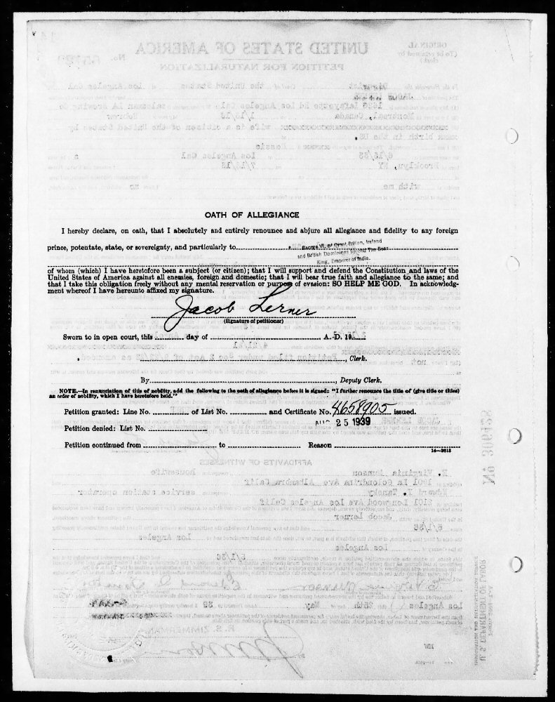 Oath of Allegiance: August 25, 1939 - Certificate #4658905.