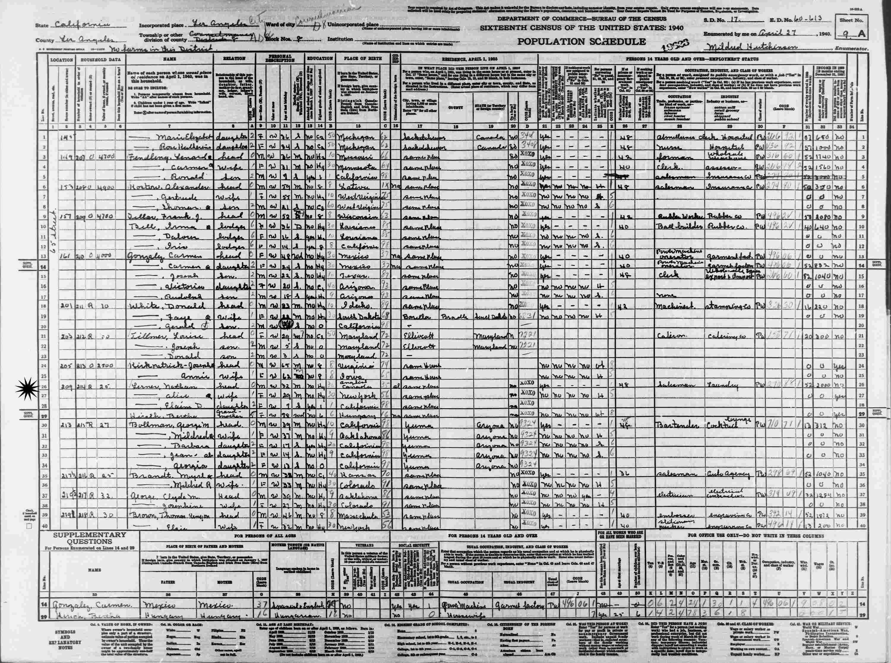 April 27, 1940 - 209 65th Street, Block 8, Councilmanic D8, Assembly District 66, Supervisor's District 17, Enumeration District 60-613, Los Angeles, Los Angeles County, California.