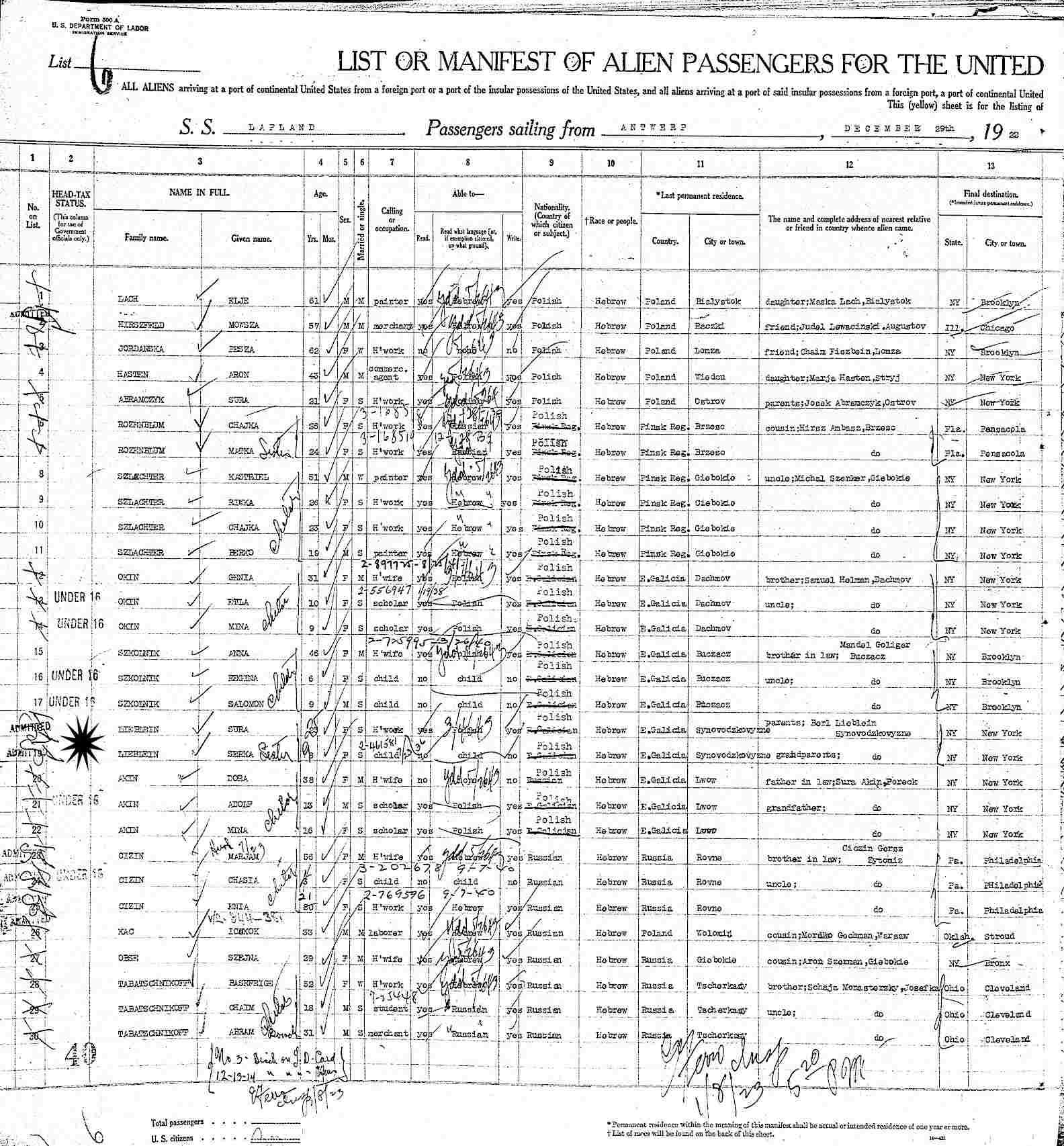 Immigration: December 29, 1922-January 8, 1923 - Ship: Lapland from Antwerp, Belgium.
