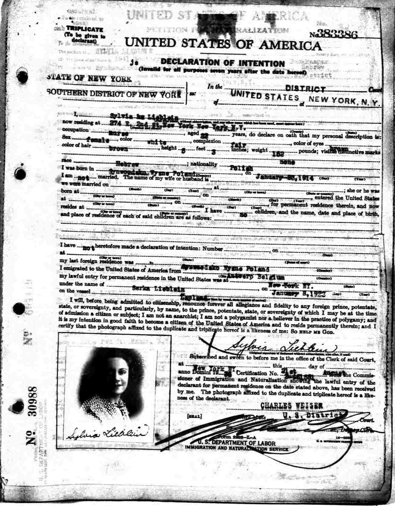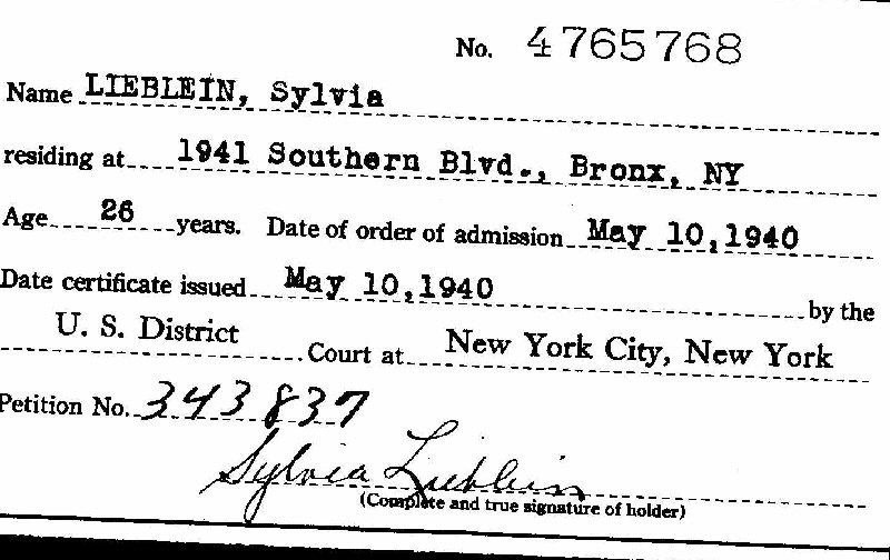 Nauralization: May 10, 1940, Bronx, New York.