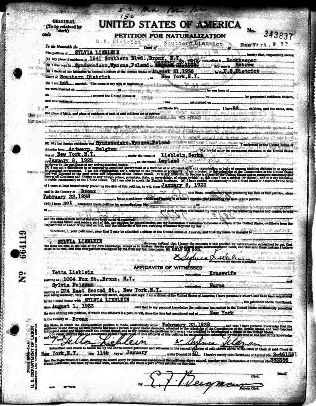 Petition of Naturalization: January 11, 1940 (#343837).