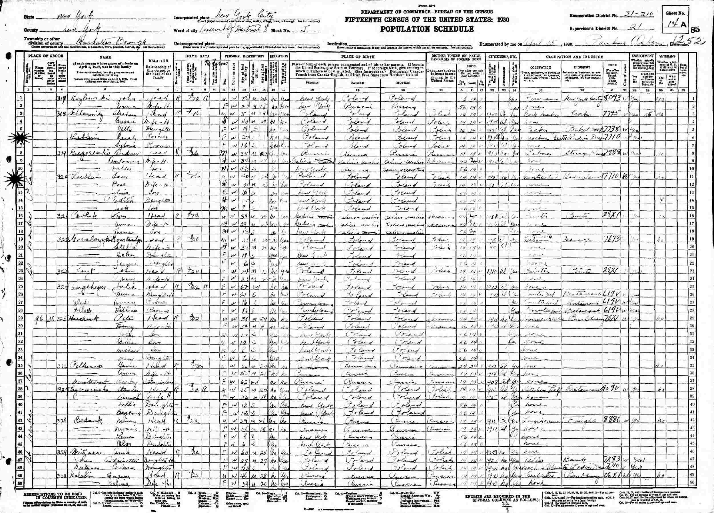April 15, 1930 - St Marks Place, Assembly District 8, Block J, Supervisor's District 21, Enumeration District 31-210, Manhattan, New York, New York.