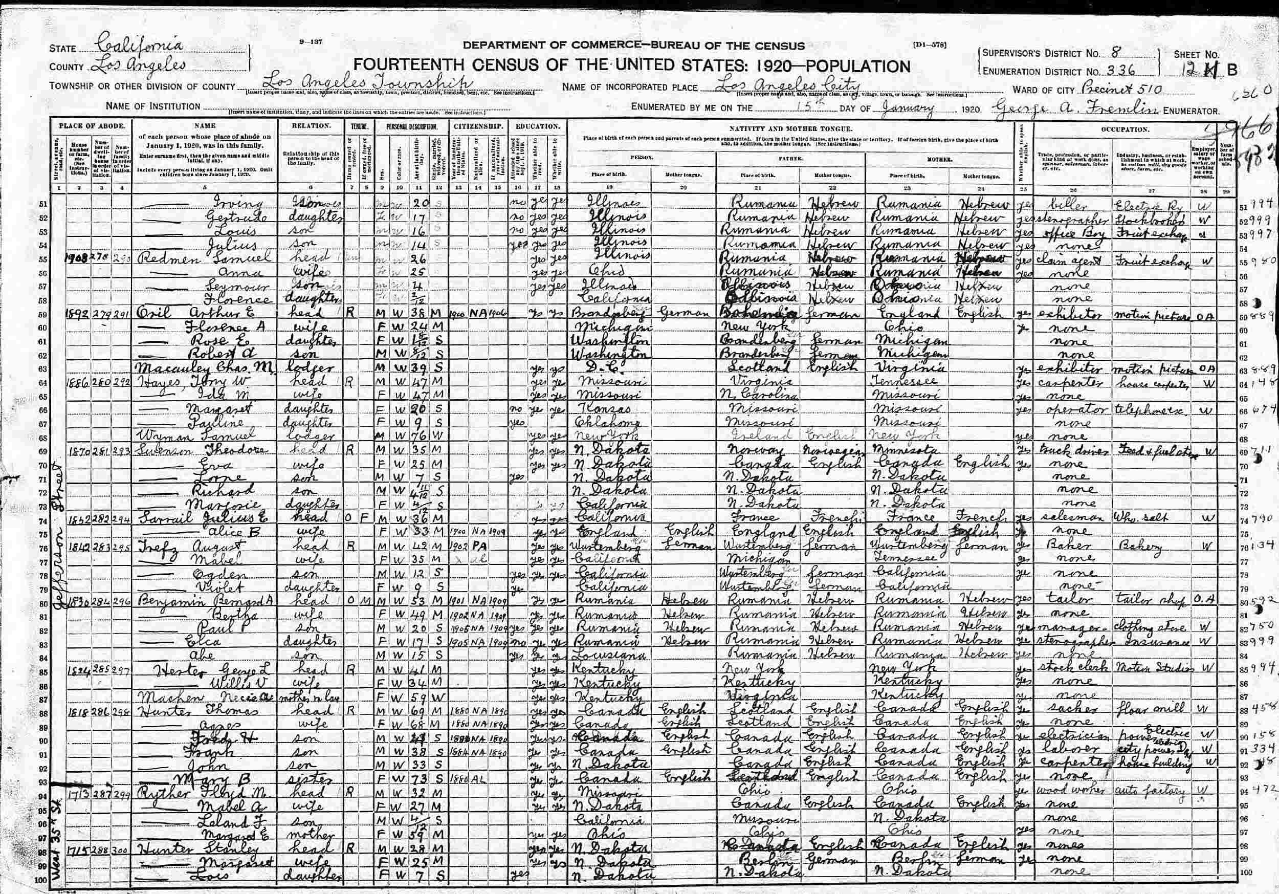 January 15, 1920 - 1908 Jefferson Street, Precinct 510, Supervisor's District 8, Enumeration District 336, Los Angeles, Los Angeles County, California.