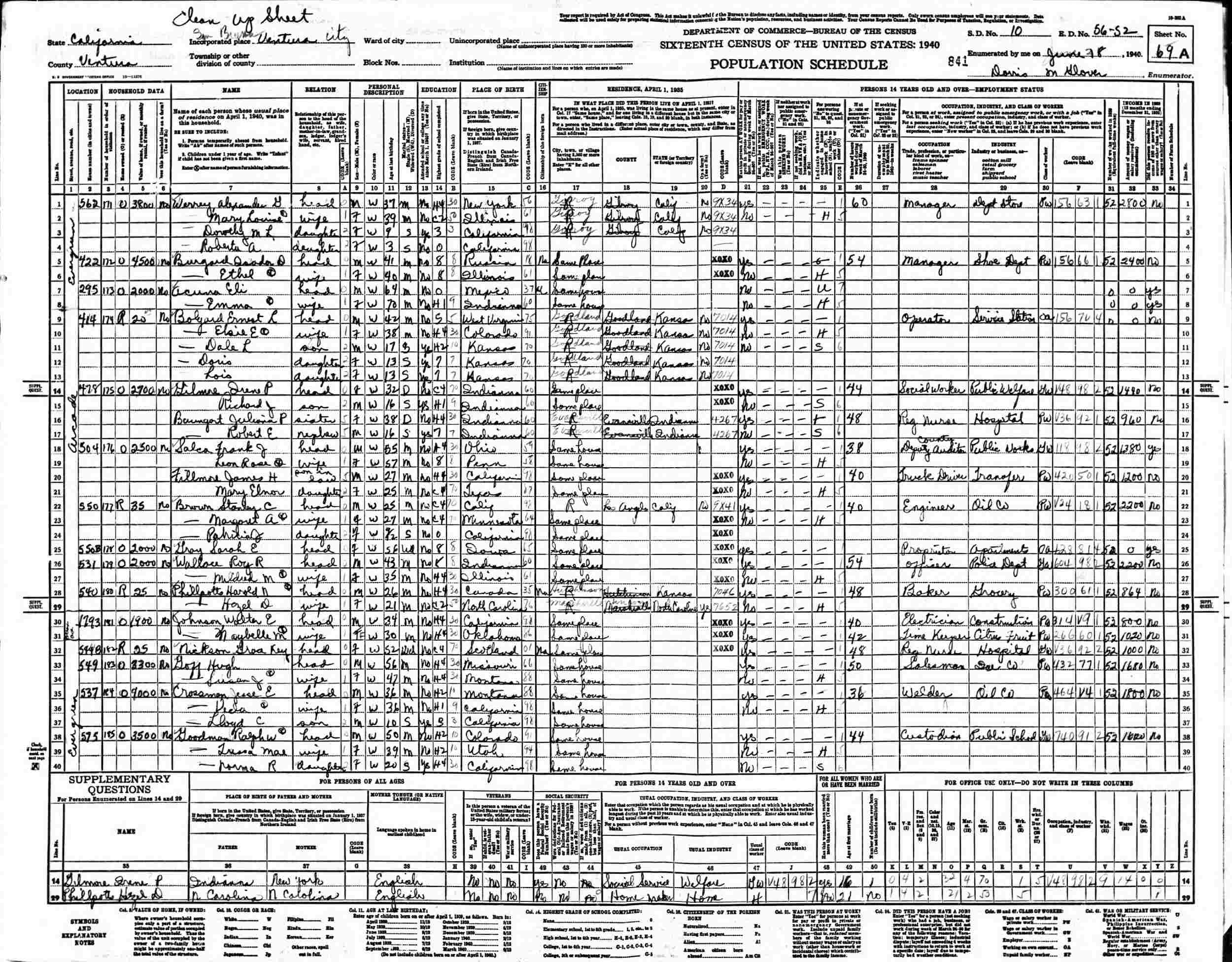 June 18, 1940 - 422 Evergreen, Supervisor's District 10, Enumeration District 56-52, San Buenaventura, Ventura County, California.