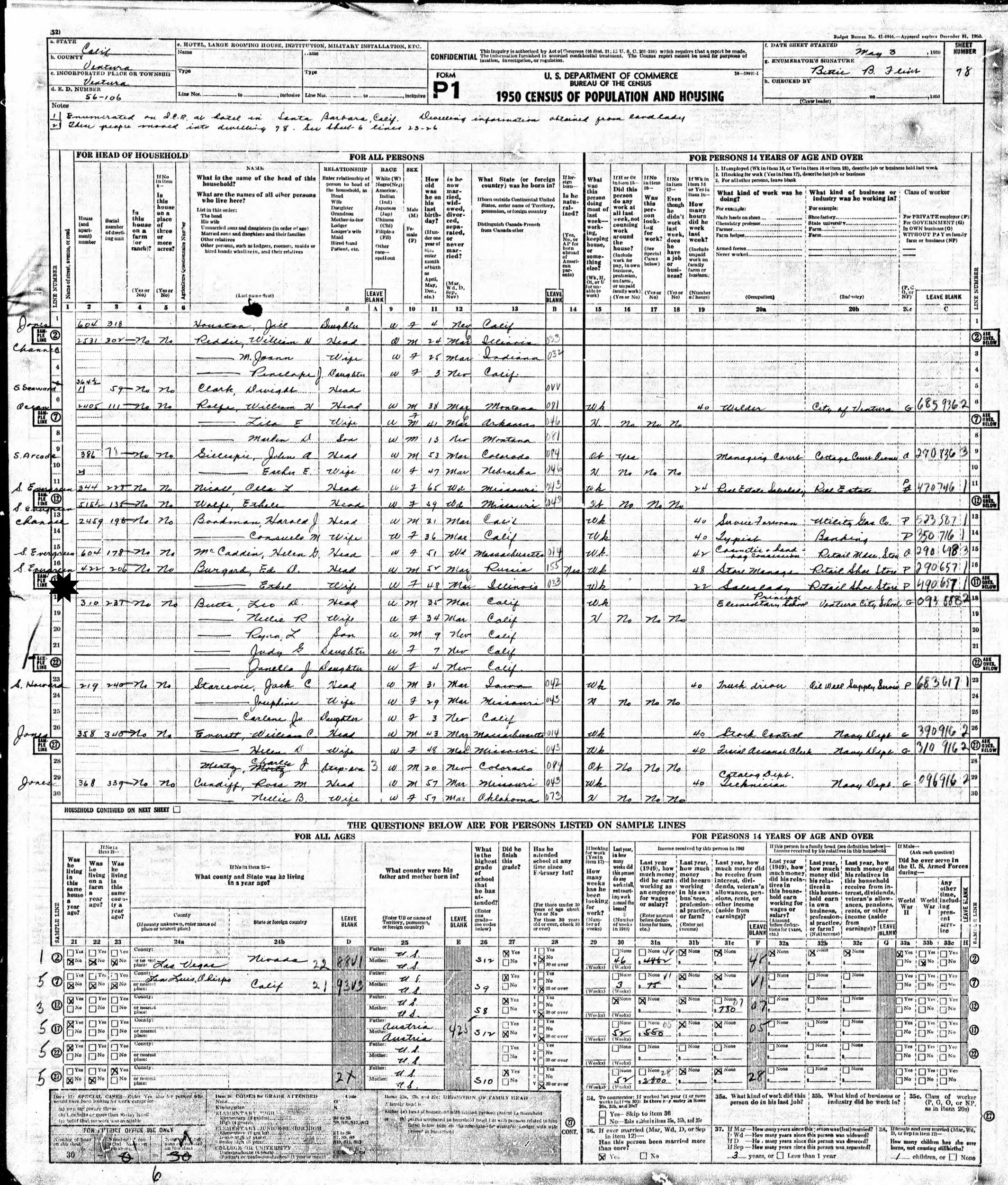 May 3, 1950 - 422 S. Evergreen, Enueration District 56-106, Ventura, Ventura County, California.