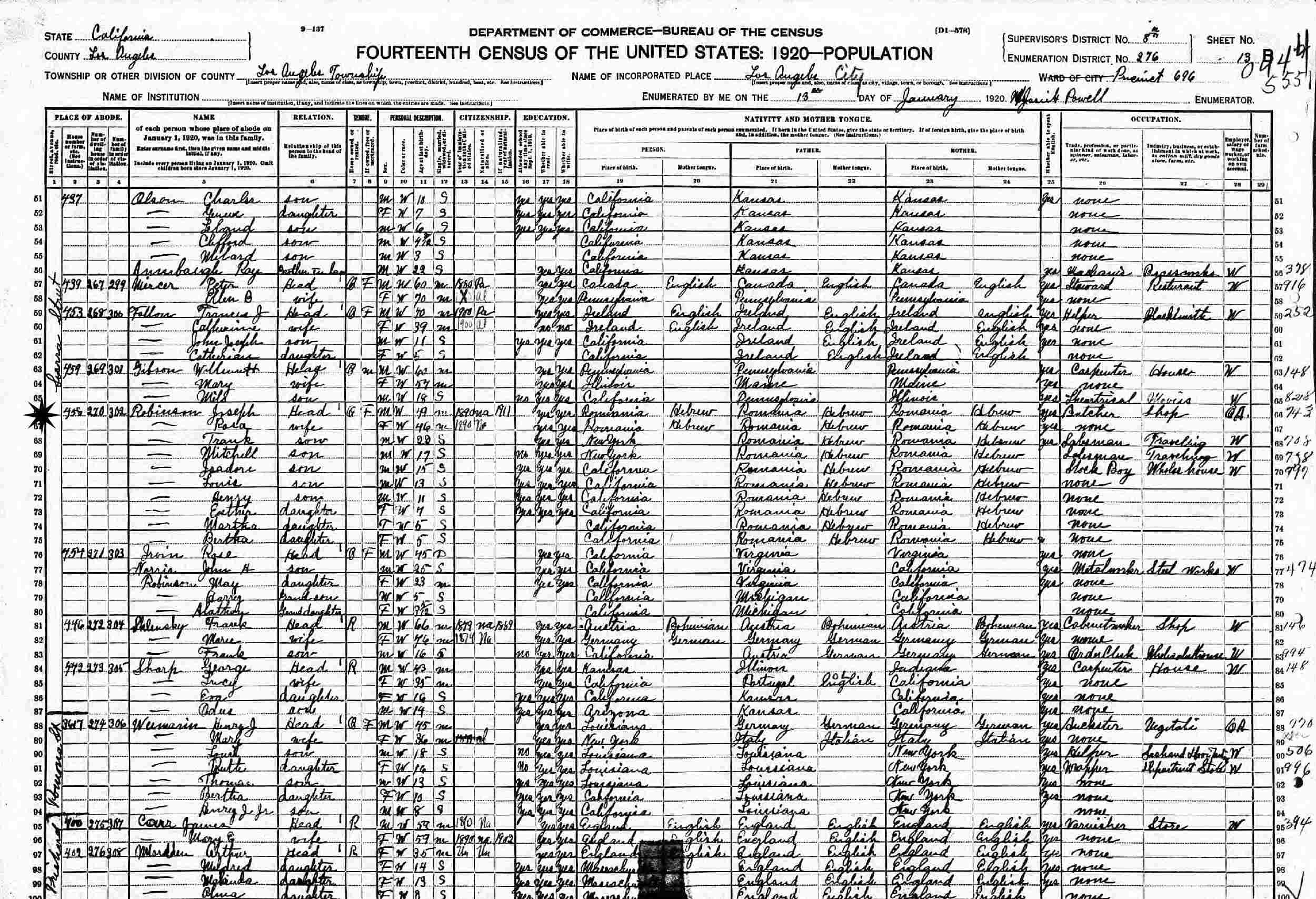 January 13, 1920 - 458 Sierra Street, Supervisor's District 8, Enumeration District 276, Los Angeles, Los Angeles County, California.