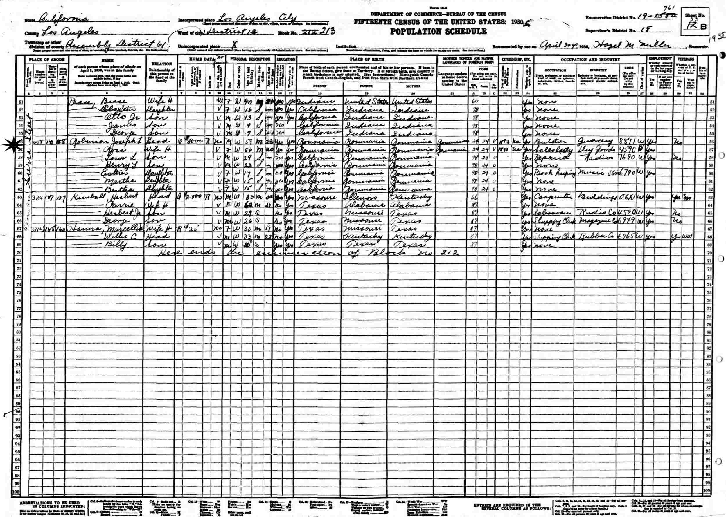 April 3-4, 1930 - 408 Sierra Street, Assembly District 61, Ward 13, Block 212 (crossed out to 213), Supervisor's District 68, Enumeration District 19-2580 (crossed out to 19-761), Los Angeles, Los Angeles County, California.