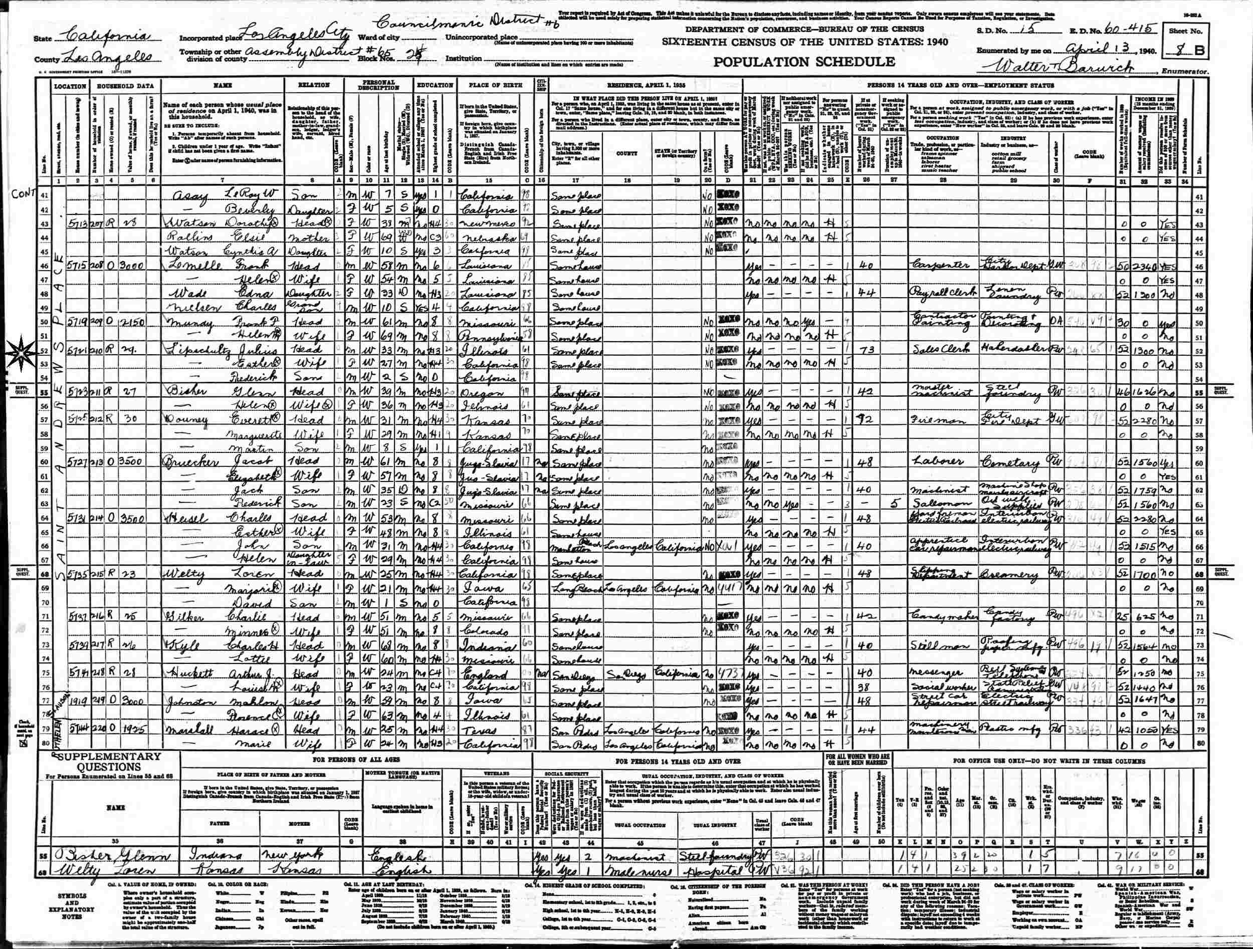 April 13, 1940 - 4721 Saint Andrews Place, Assembly District 65, Block 24, Councilmanic District 6, Supervisor's District 15, Enumeration District 60-415, Los Angeles, Los Angeles County, California.
