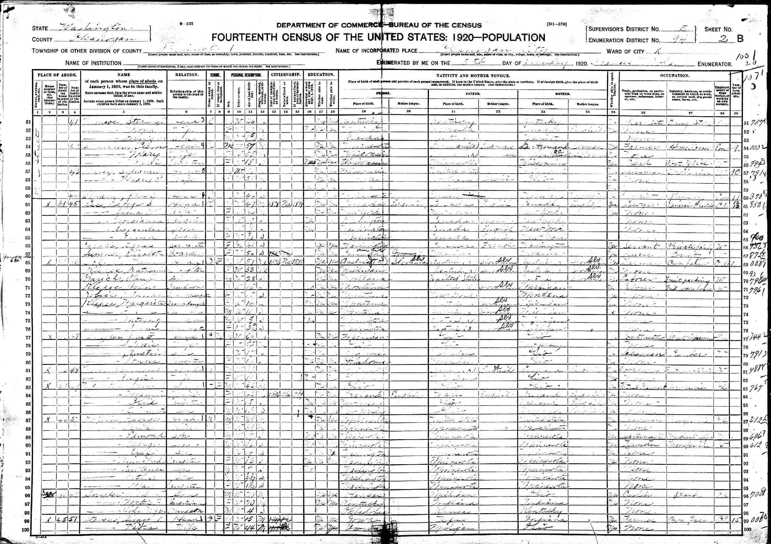 January 5, 1920 - Precinct 1, Supervisor's District 5, Enumeration District 94, Okanogan, Okanogan County, Washington.