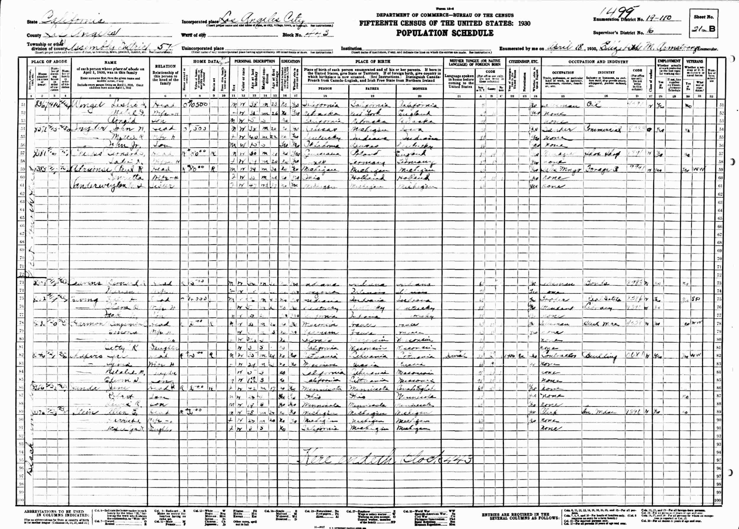April 18, 1930 - 8376 West Fourth Street, Assembly District 57, Block 443, Supervisor's District 16, Enumeration District 19-110, Los Angeles, Los Angeles County, California.