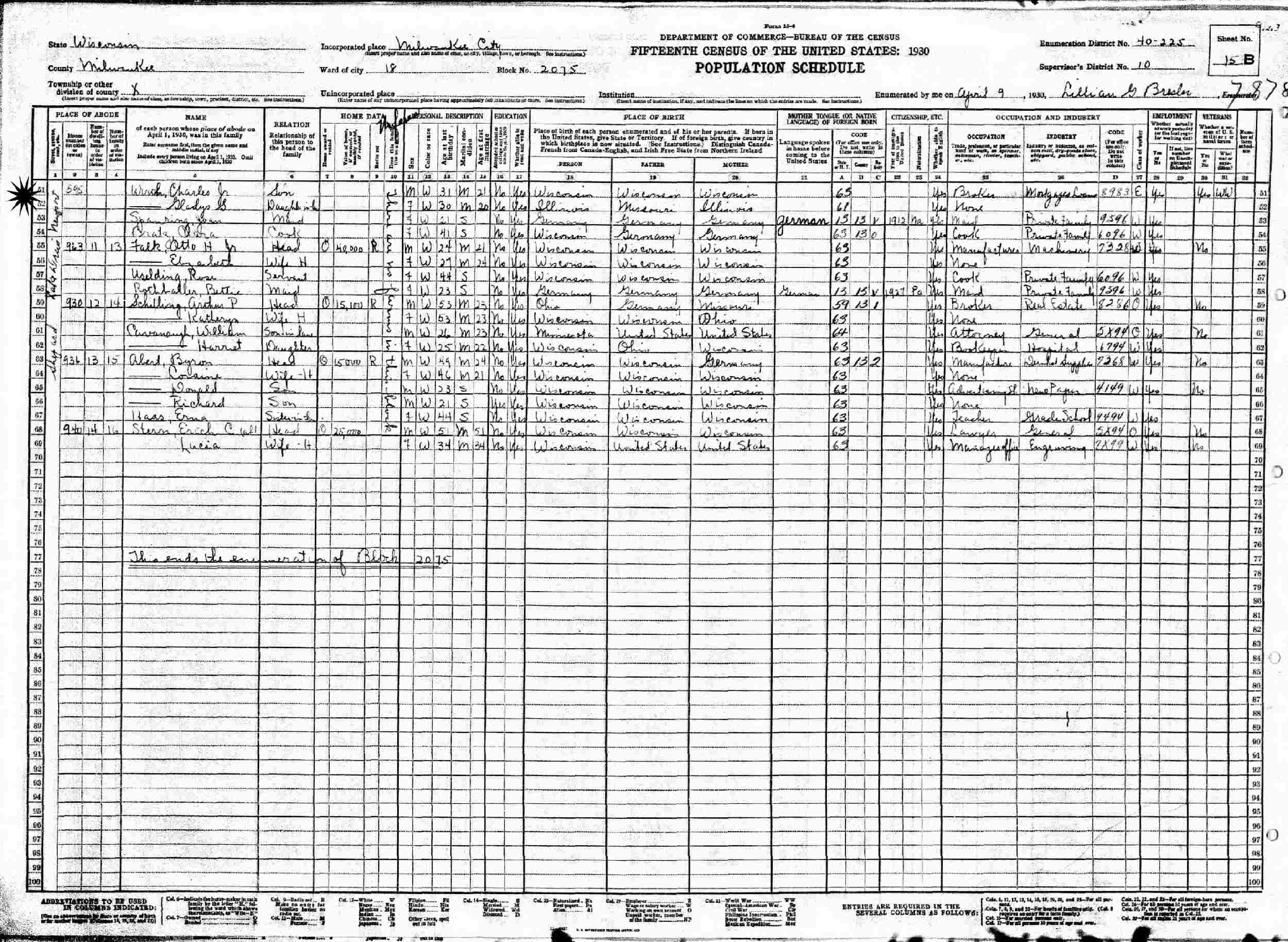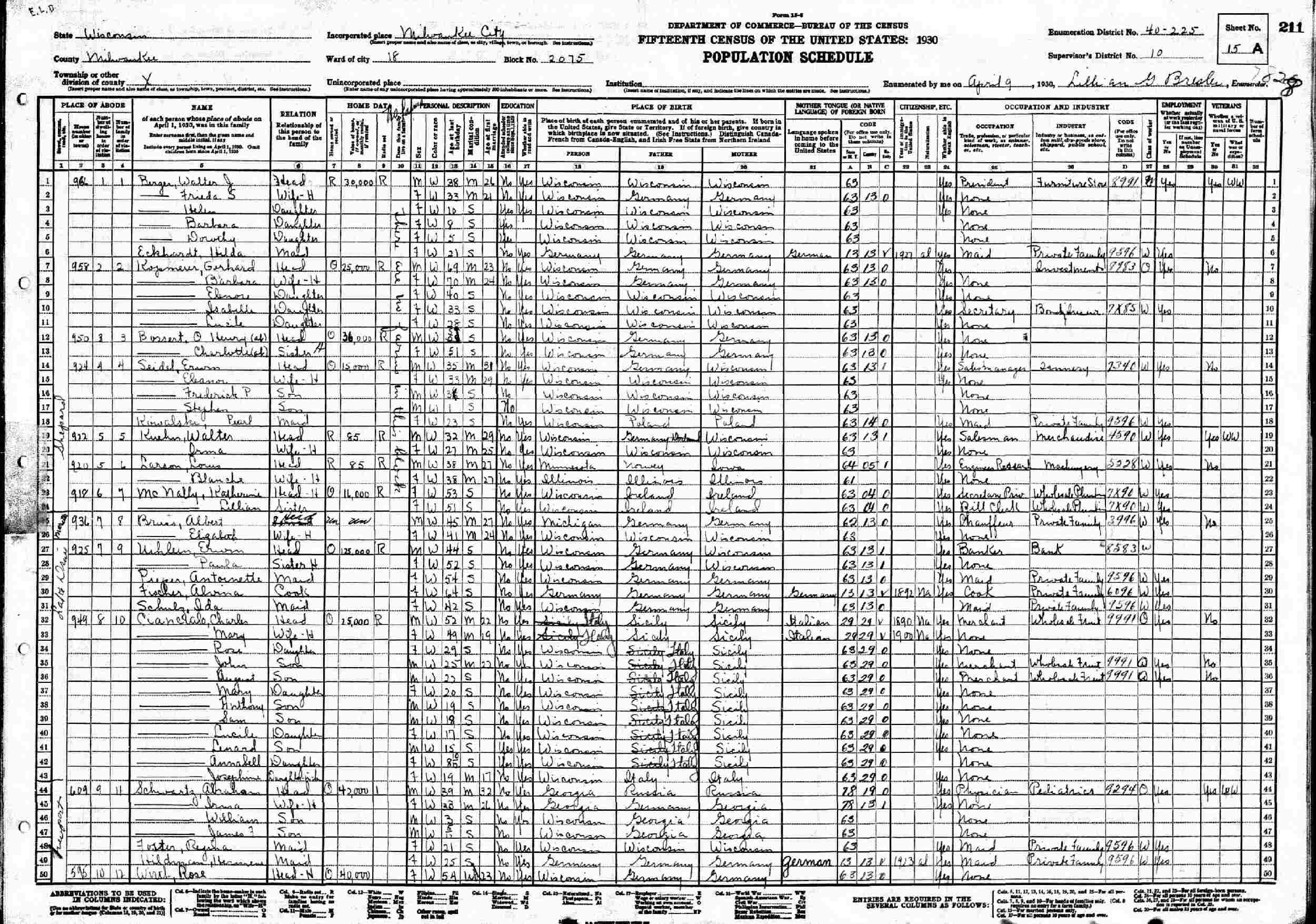 April 9, 1930 - 595 Newport, Ward 18, Block 2075, Supervisor's District 10, Enumeration District 40-225, Milwaukee, Milwaukee County, Wisconsin.