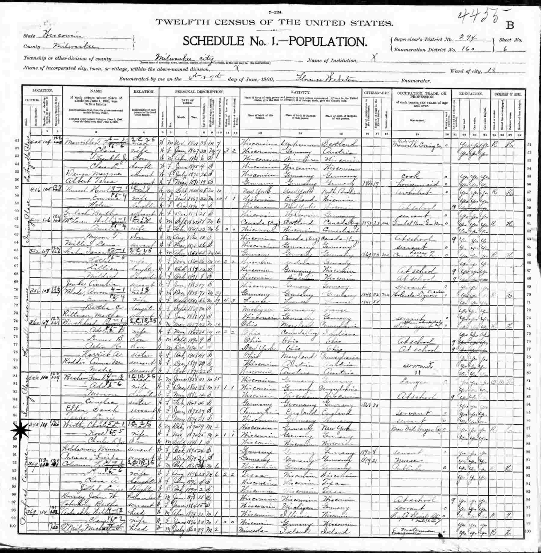 April 6-7, 1900 - 345 Prospect Avenue, Ward 18, Supervisor's District 294, Enumeration District 160, Milwaukee, Milwaukee County, Wisconsin.