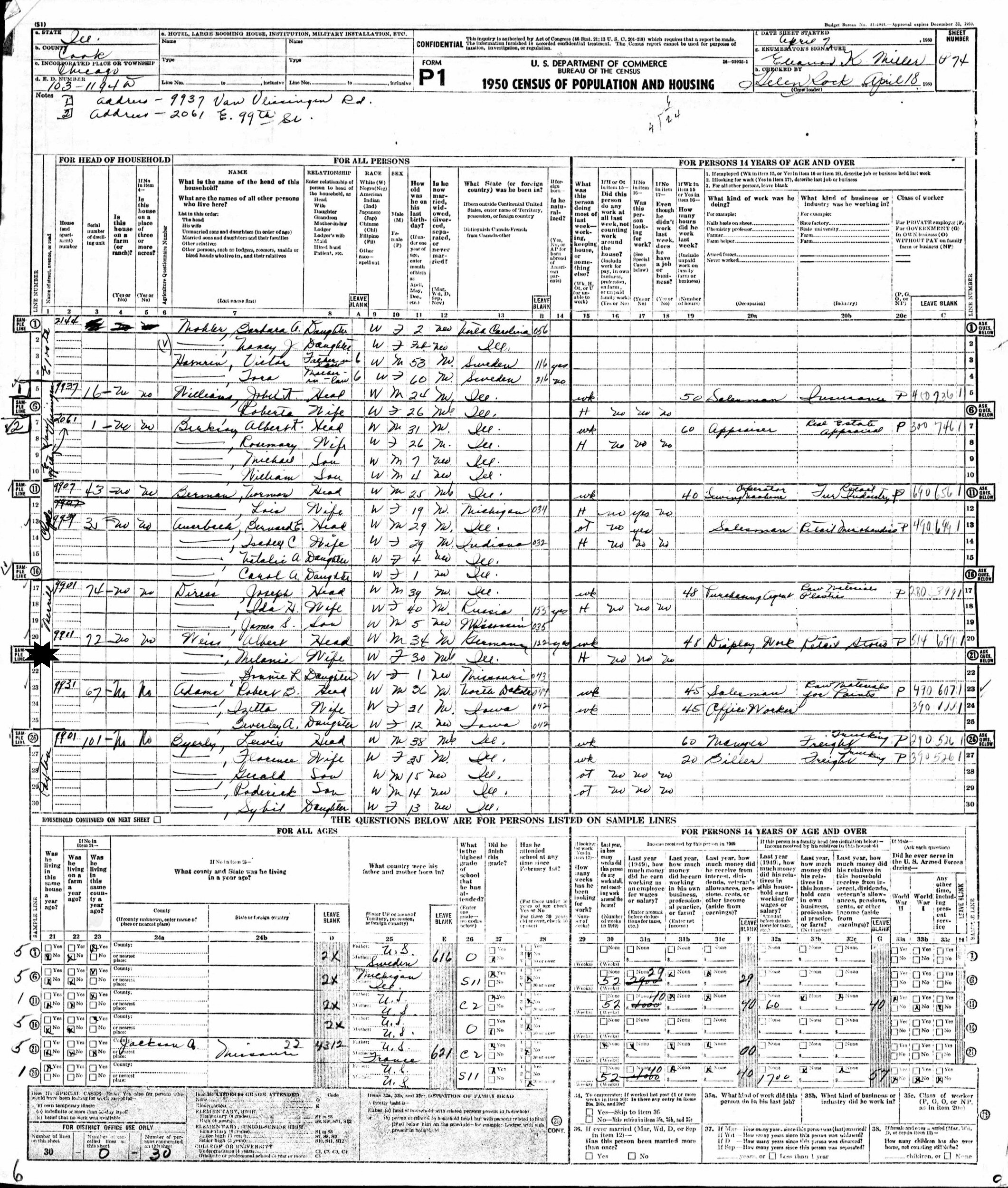 April 18, 1950 - 9911 Merrill, Enumeration Ditrict 103-1194D, Helen Rock, Cook County, Illinois.