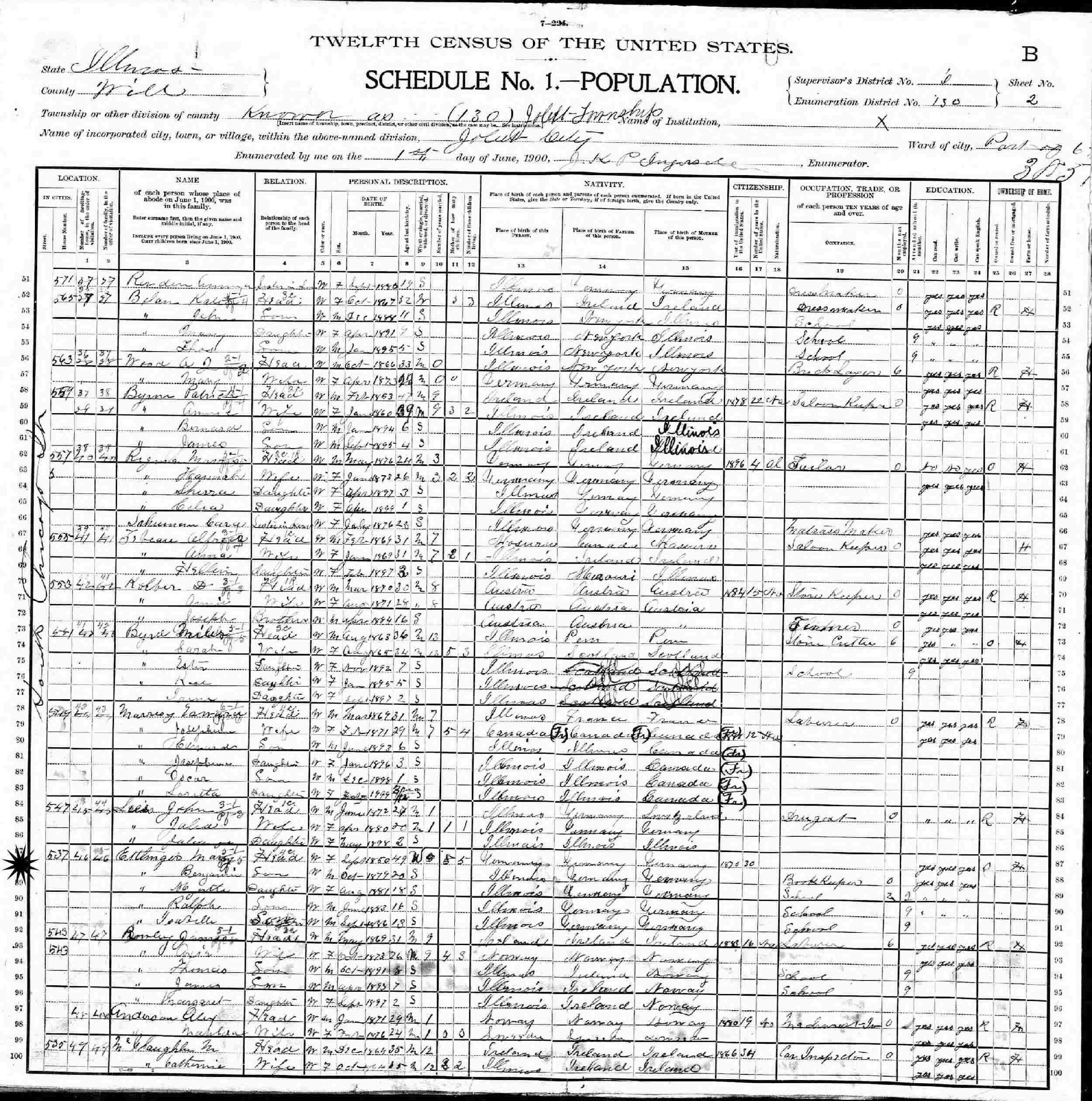 June 1, 1900 - 537 S. Chicago, Part of Ward 6, Supervisor's District 6, Enumeration District 130, Joliet, Will County, Illinois.
