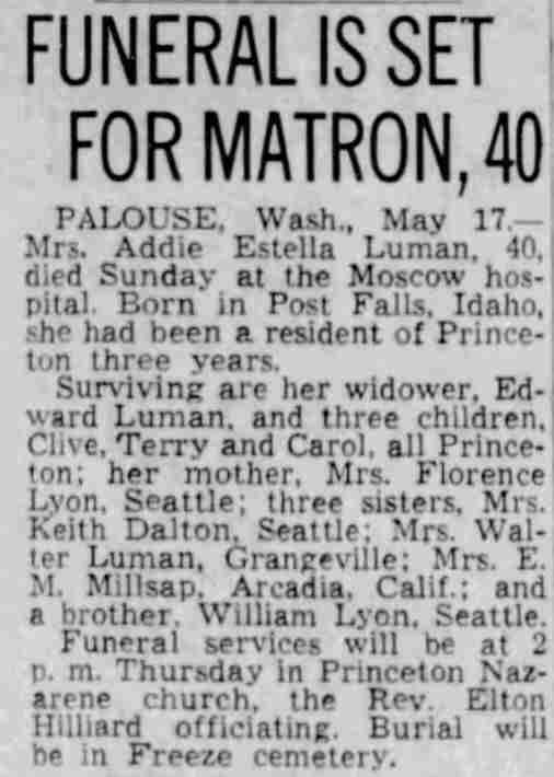 Married: Edward Loren Luman April 9, 1938 in Spokane, Spokane County, Washington.