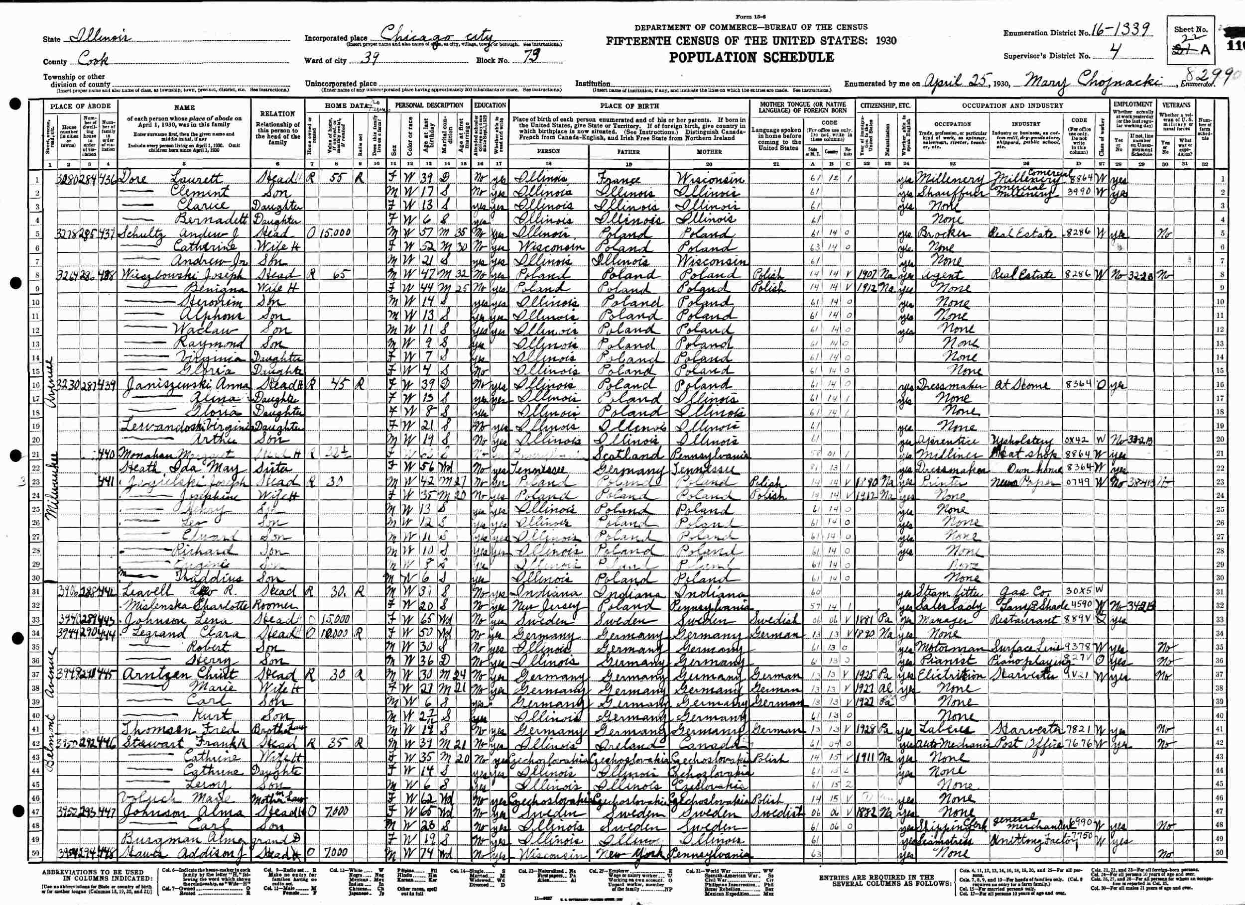 April 25, 1930 - 3954 Milwaukee Avenue, Ward 39, Block 73, Supervisor's District 4, Enumeration District 16-1339, Chicago, Cook County, Illinois.