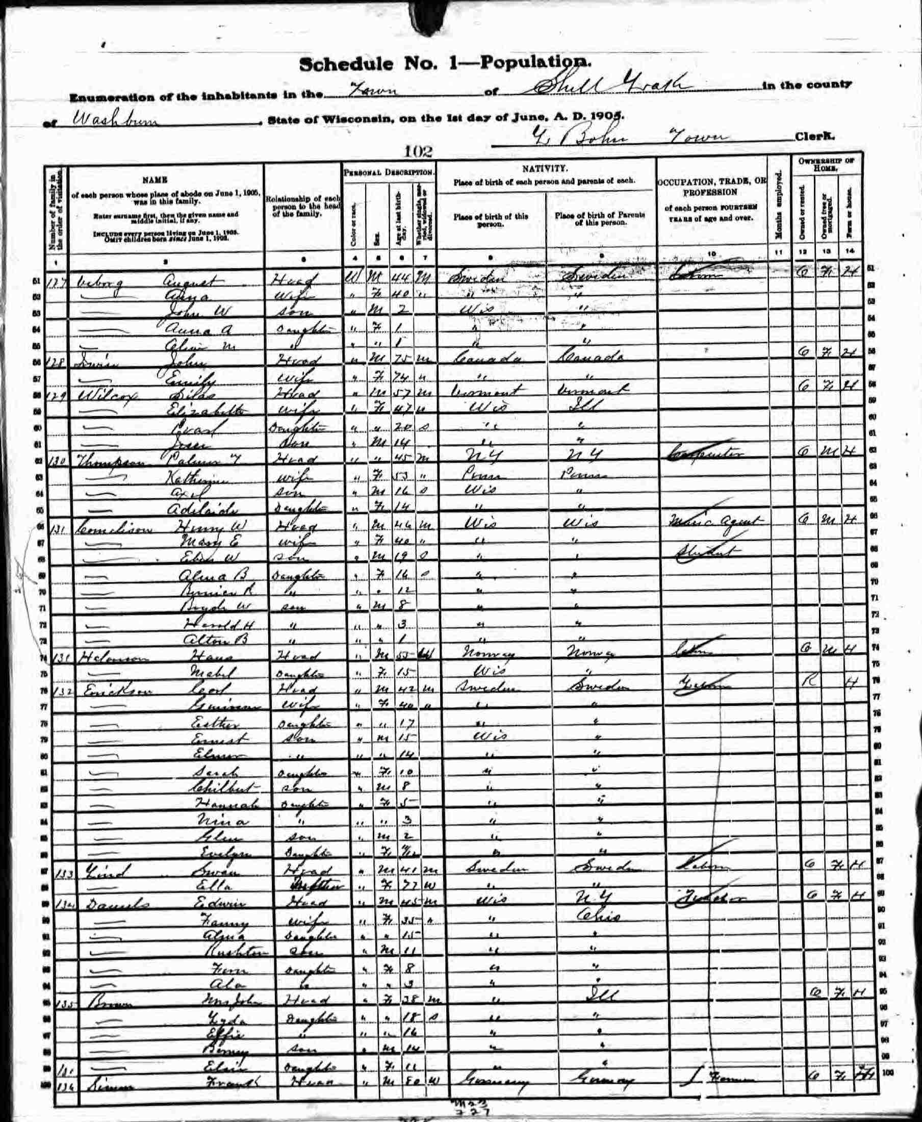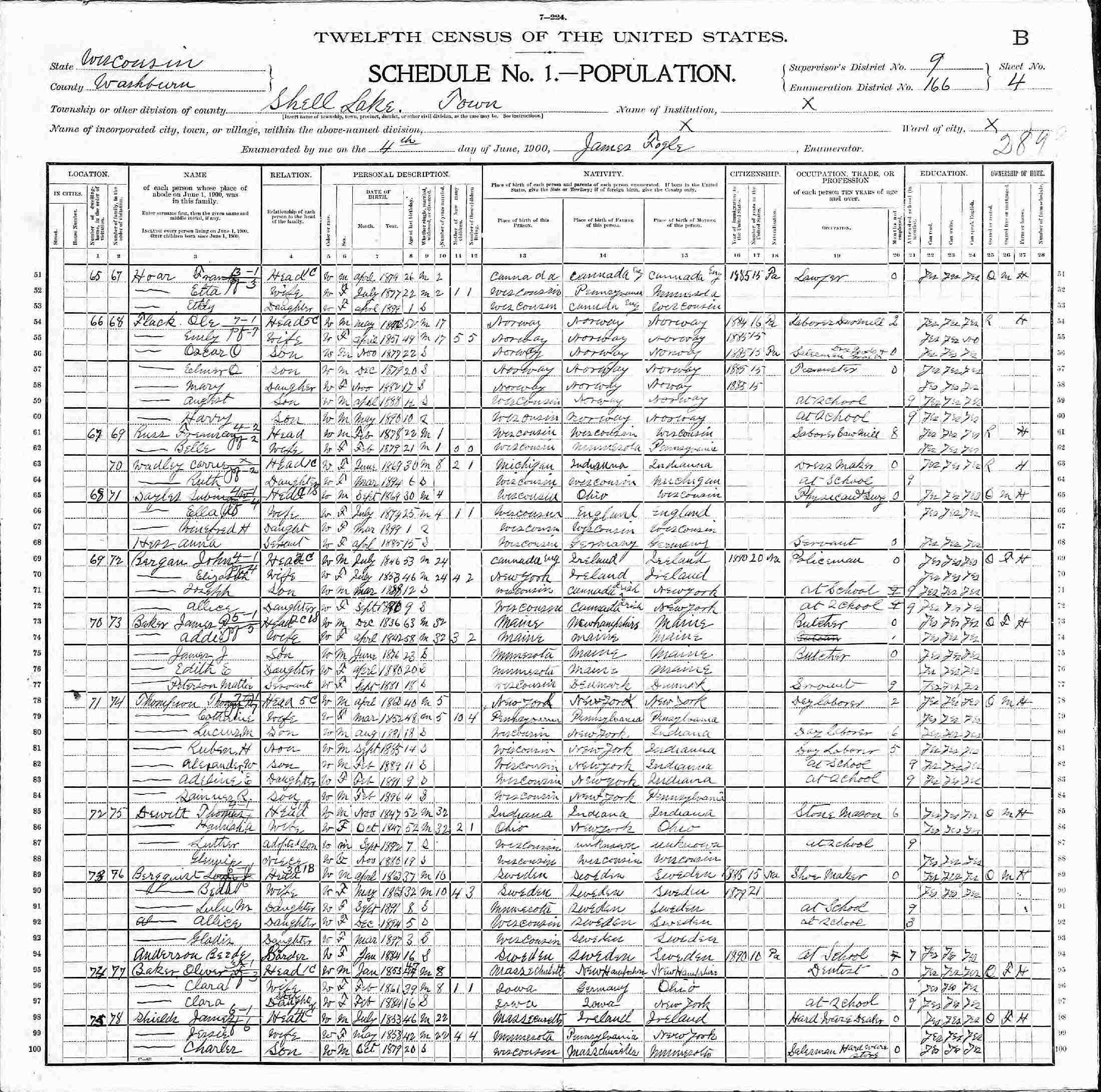 June 4, 1900 - Supervisor's District 9, Enumeration District 166, Shell Lake, Washburn County, Wisconsin.