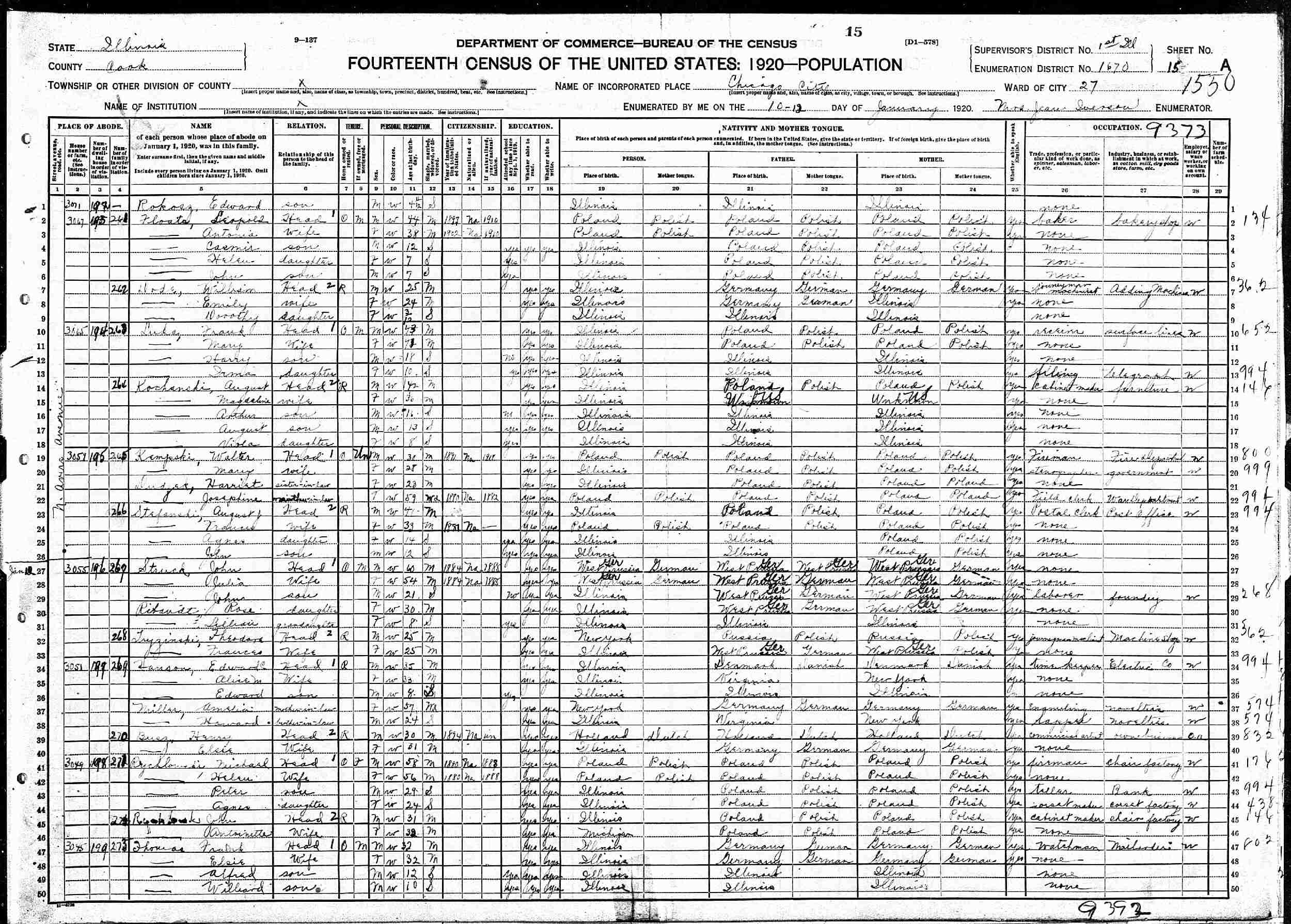 January 10-12, 1920 - 3045 N Avers Avenue, Ward 27, Supervisor's District 1, Enumeration District 1670, Chicago, Cook County, Illinois.