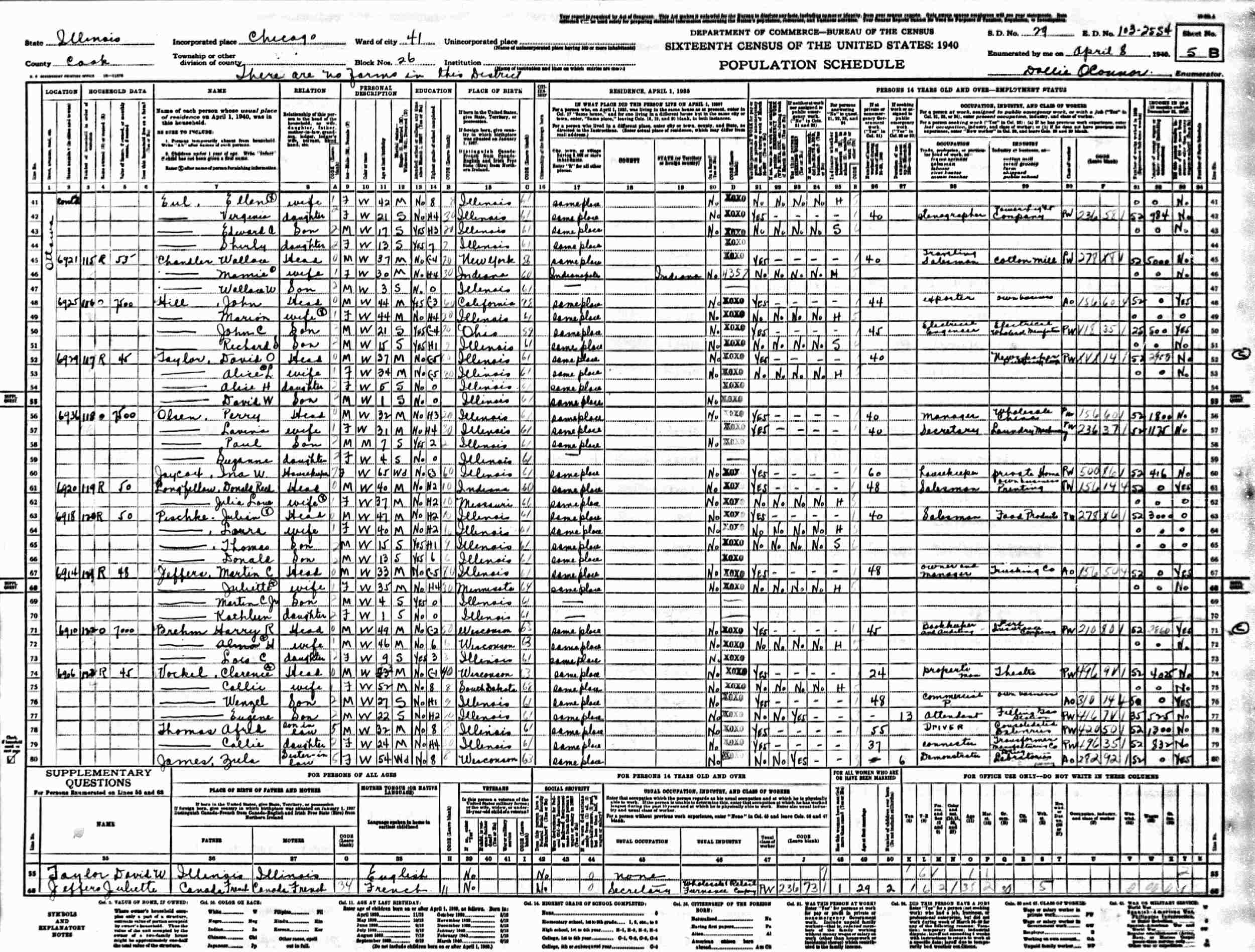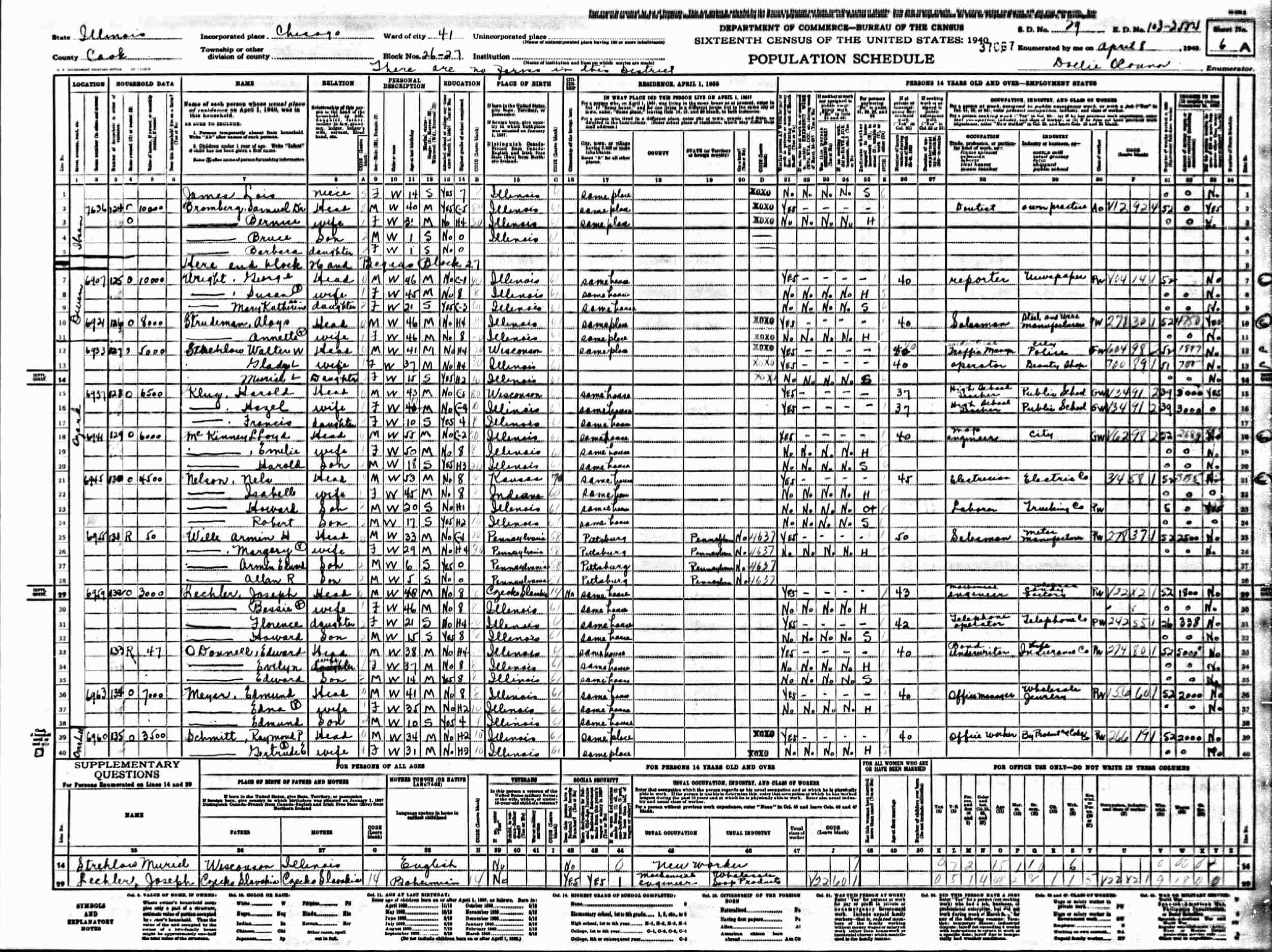 April 8, 1940 - 6906 Ottawa, Ward 41, Block 26, Supervisor's District 29, Enumeration District 103-2554, Chicago, Cook County, Illinois (w/in-laws).