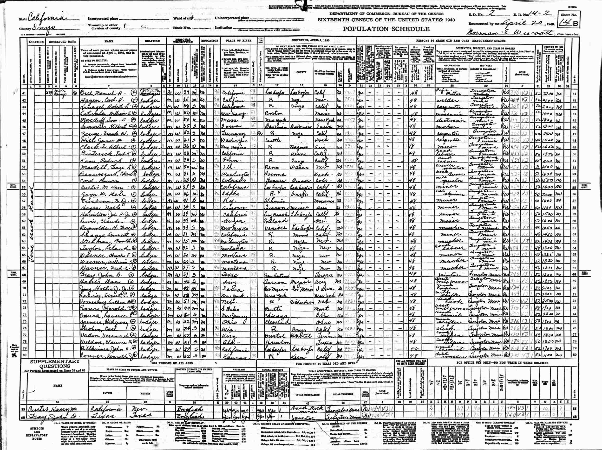 April 20, 1940 - Supervisor's District 2, Enumeration District 14-2, Inyo County, California (Married but not with wife; Lodger.)