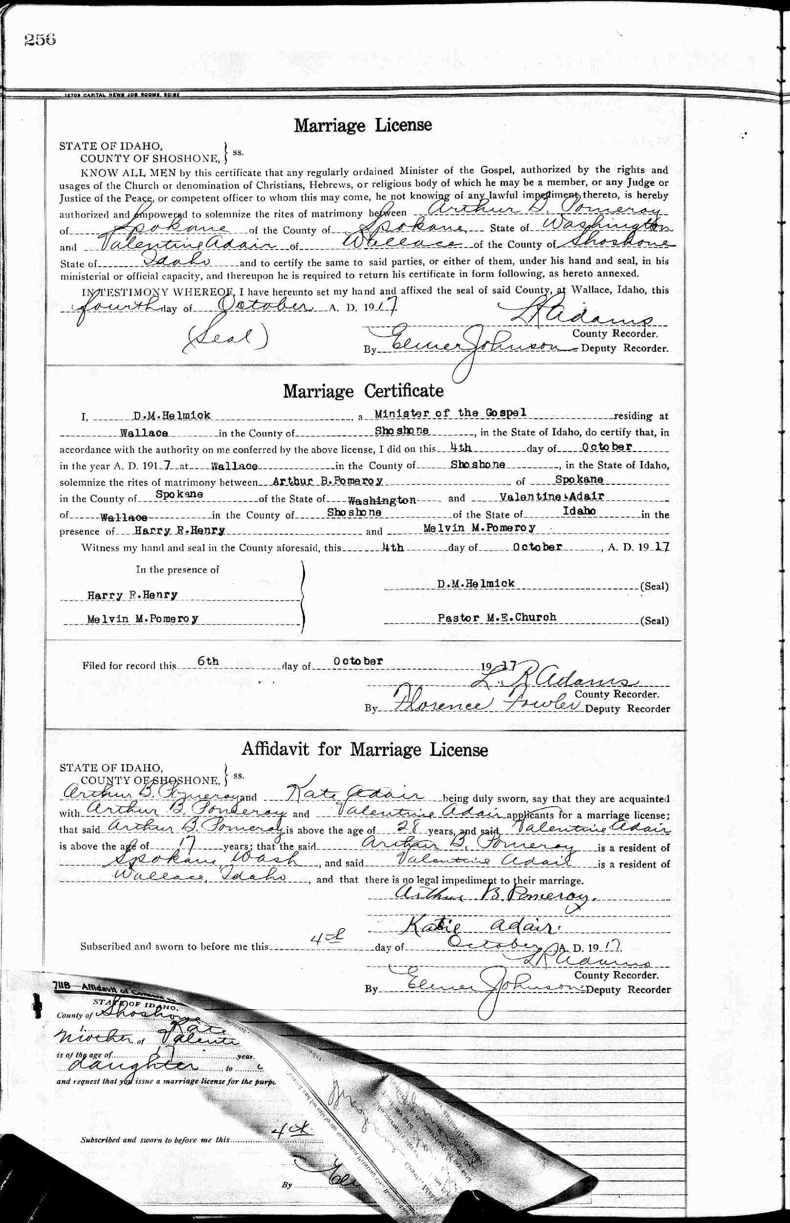 Married: Valentine I Adair October 4, 1917 in Shoshone County, Idaho.