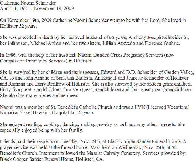 Buried: November 25, 2009 in Calvary-Sacred Heart Cemetery, Hollister, San Benito County, California.