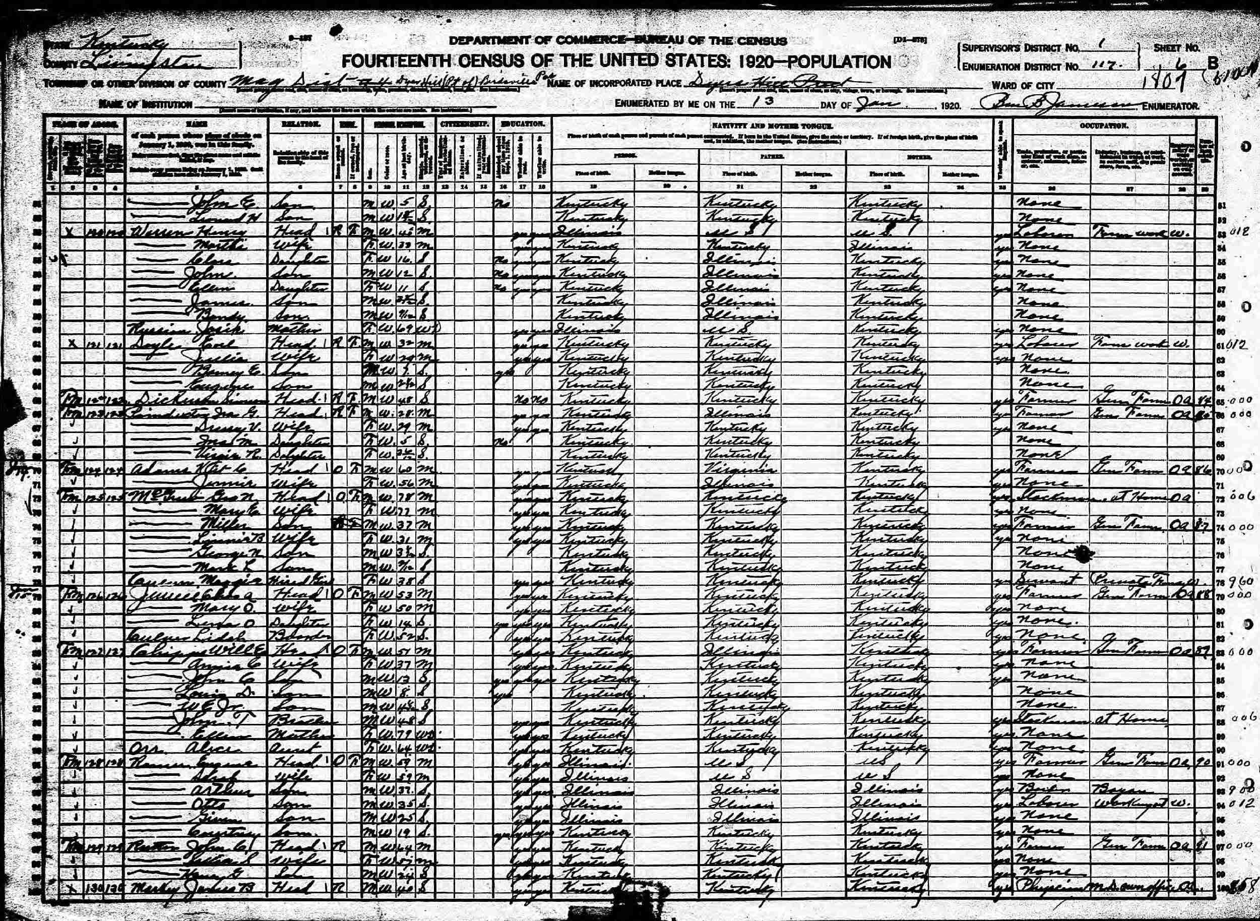 January 13, 1920 - Supervisor's District 1, Enumeration District 117, Dyers Hill Precinct, Livingston County, Kentucky.