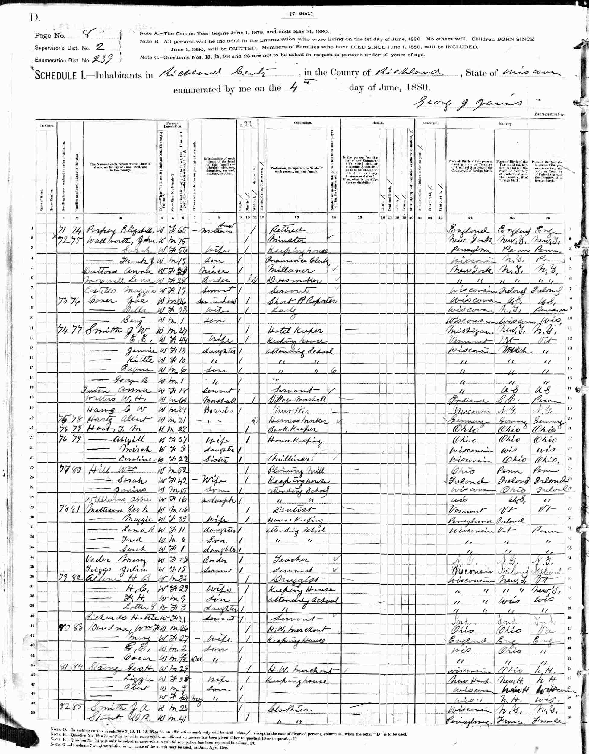 June 4, 1880 - Supervisor's District 2, Enumeration District 239, Richland Center, Richland County, Wisconsin (Boarder).