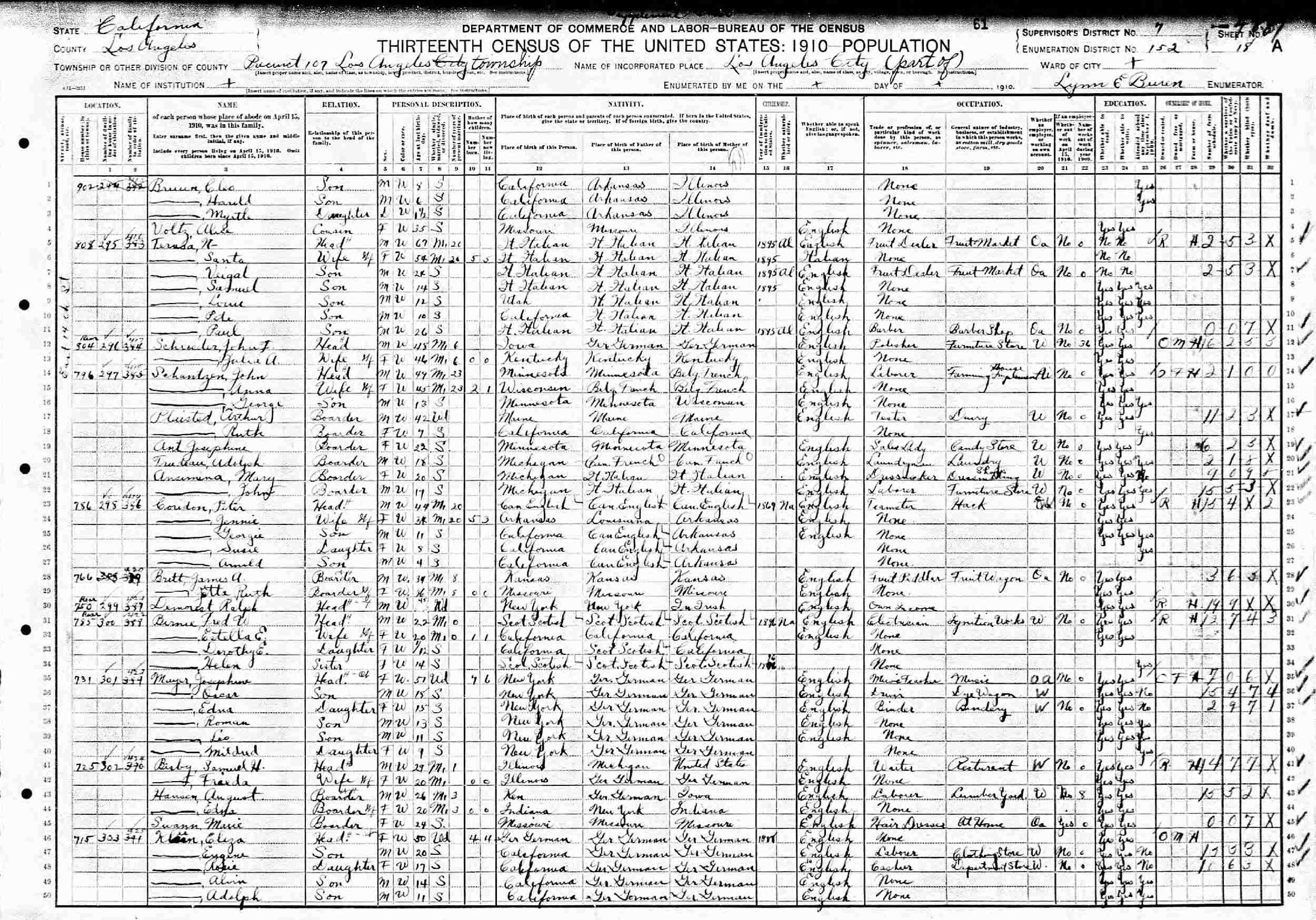 1910 - 750-Rear East 14th Street, Precinct 107, Supervisor's District 7, Enumeration District 152, Los Angeles, Los Angeles County, California.