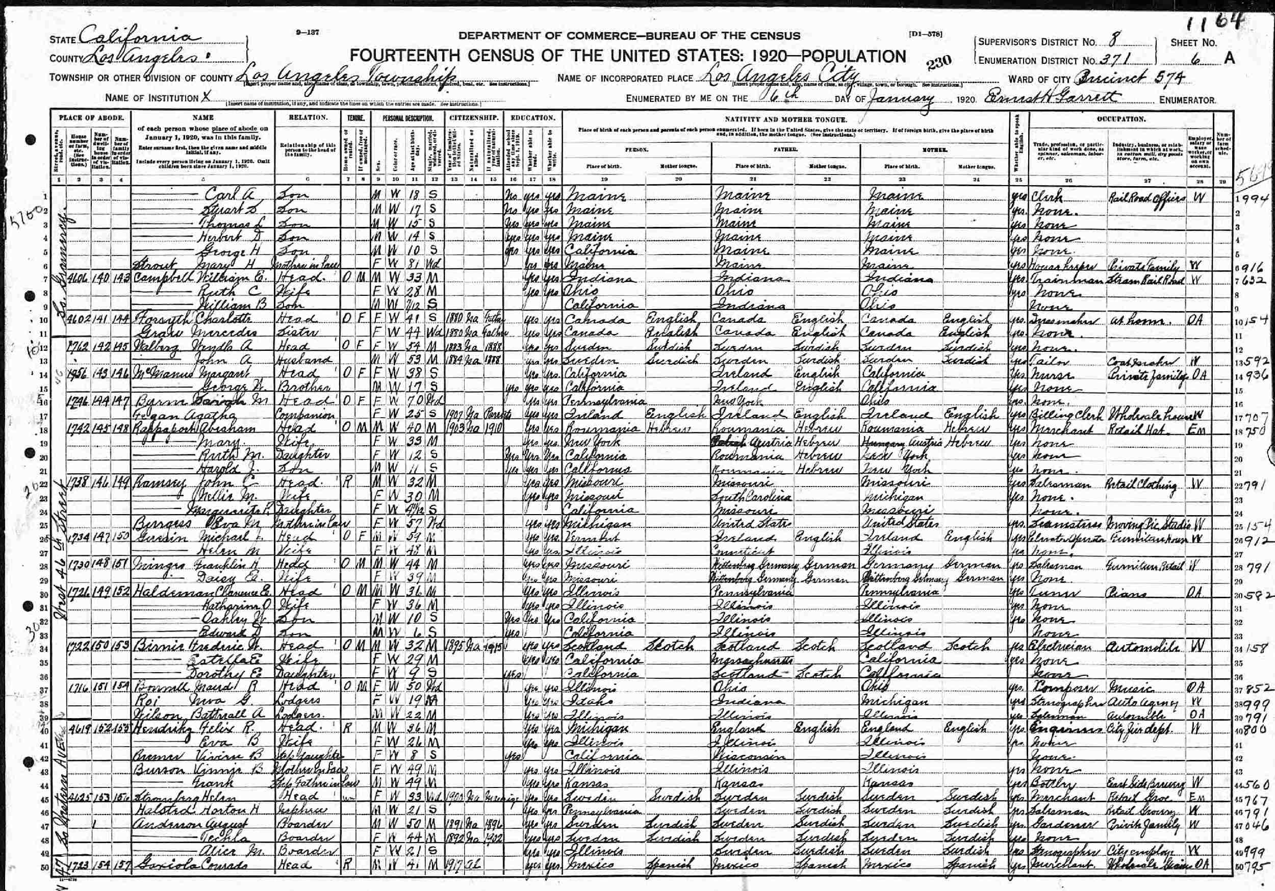 January 6, 1920 - 1722 West 46th Street, Precinct 574, Supervisor's District 8, Enumeration District 371, Los Angeles, Los Angeles County, California.