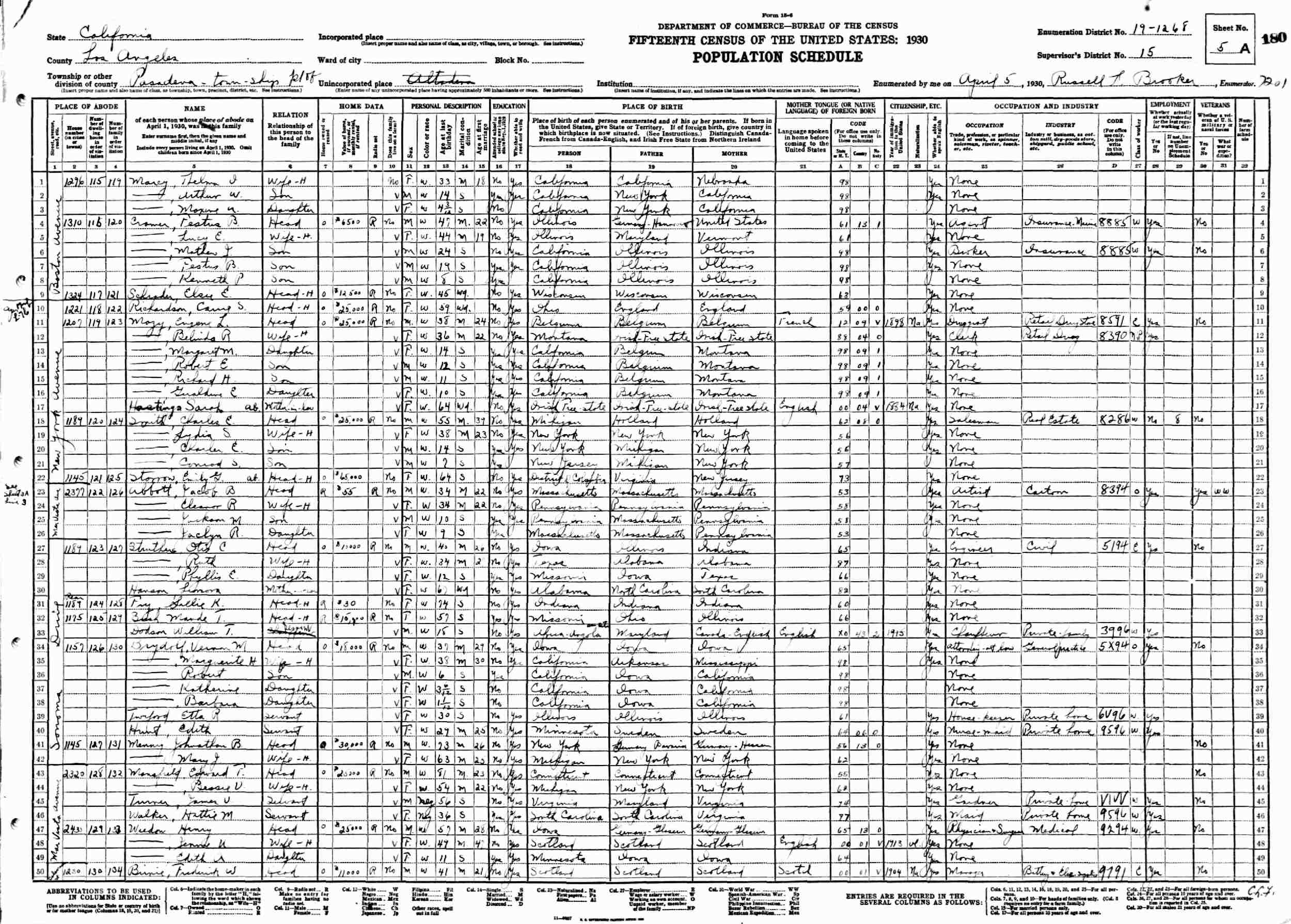 April 5, 1930 - 1230 Calaveras Street, Supervisor's District 15, Enumeration District 19-1268, Pasadena, Los Angeles County, California.