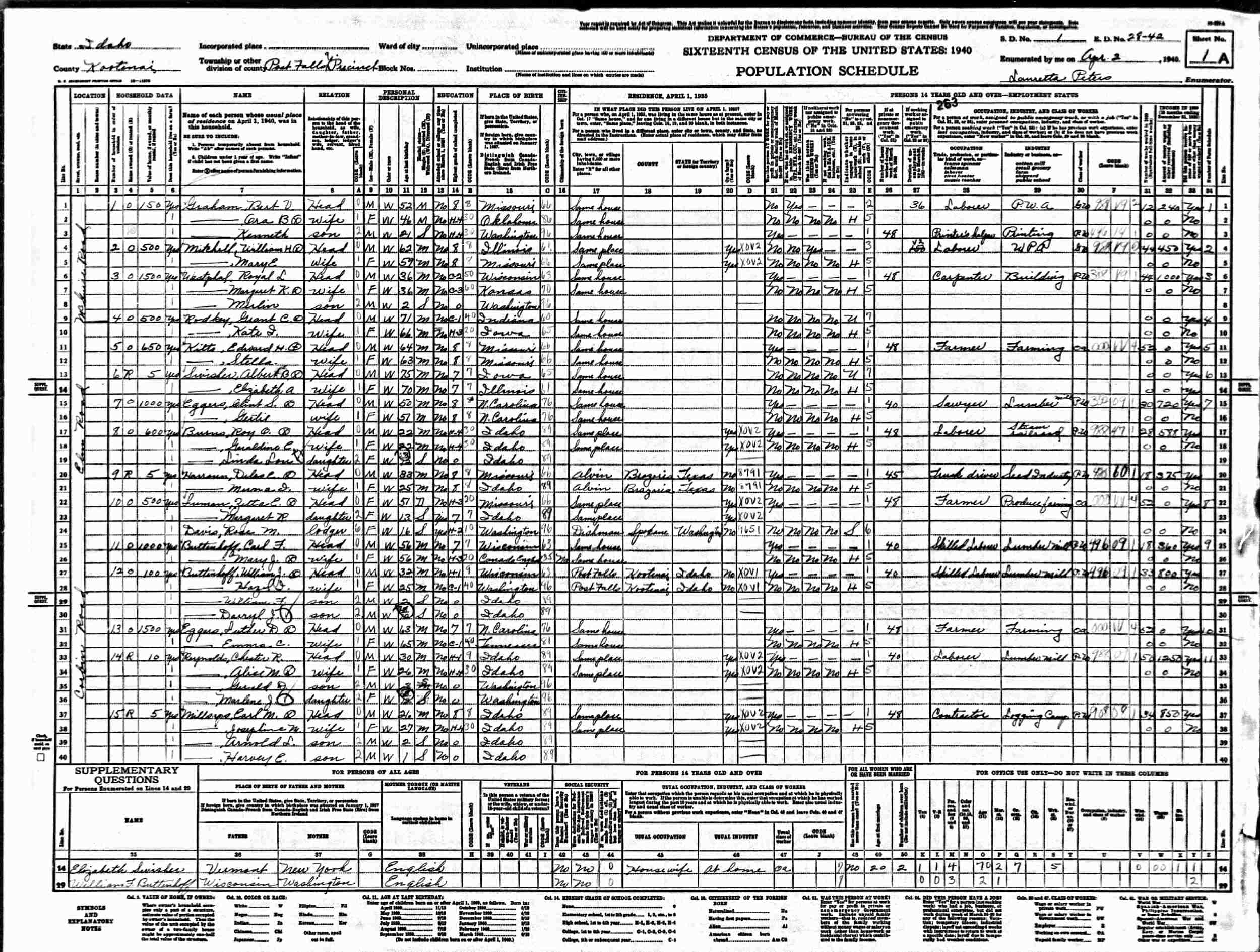 April 2, 1940 - Corbin Road, Supervisor's District 1, Enumeration District 28-42, Post Falls Precinct, Kootenai County, Idaho.