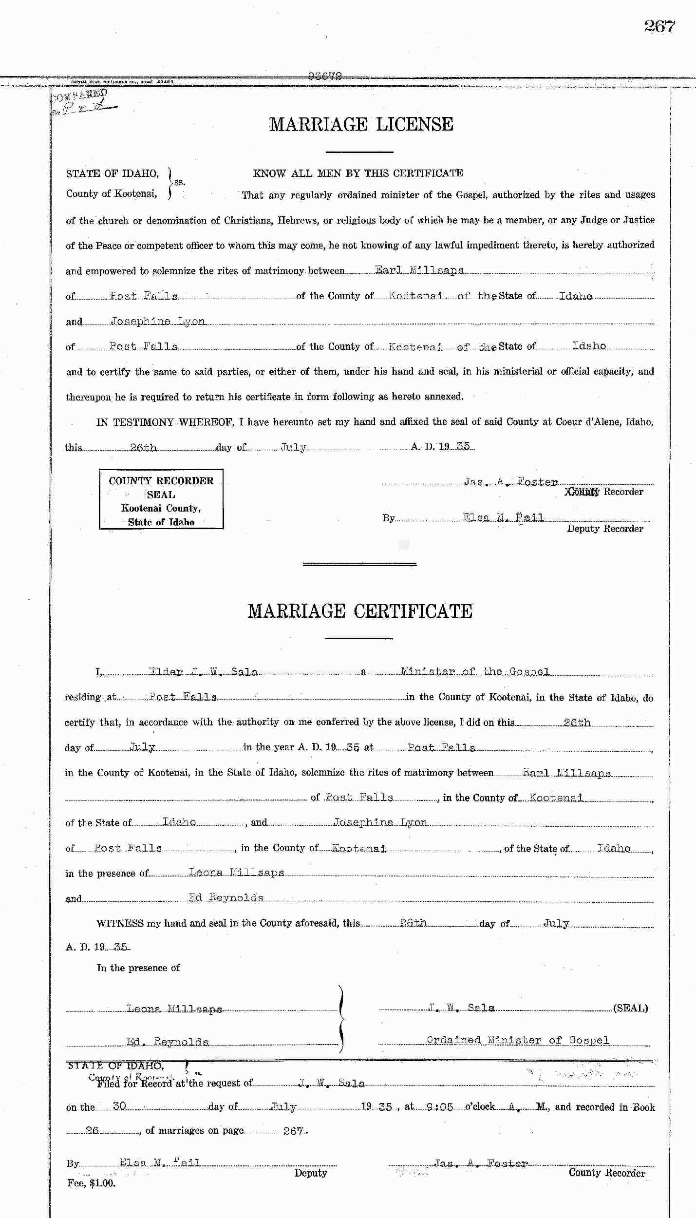 Married: Josephine May Lyon July 26, 1935 in Post Falls, Kootenai County, Idaho.