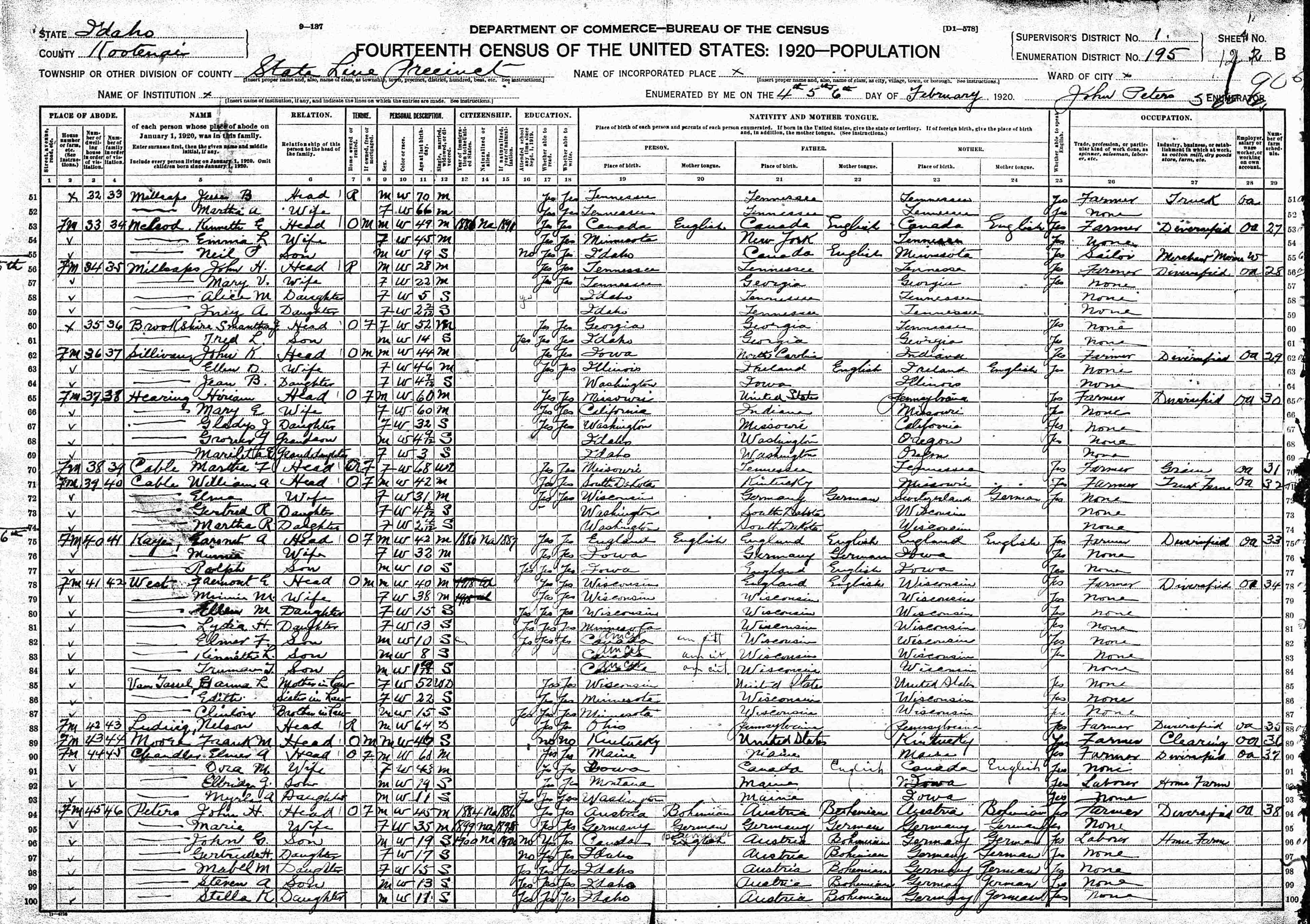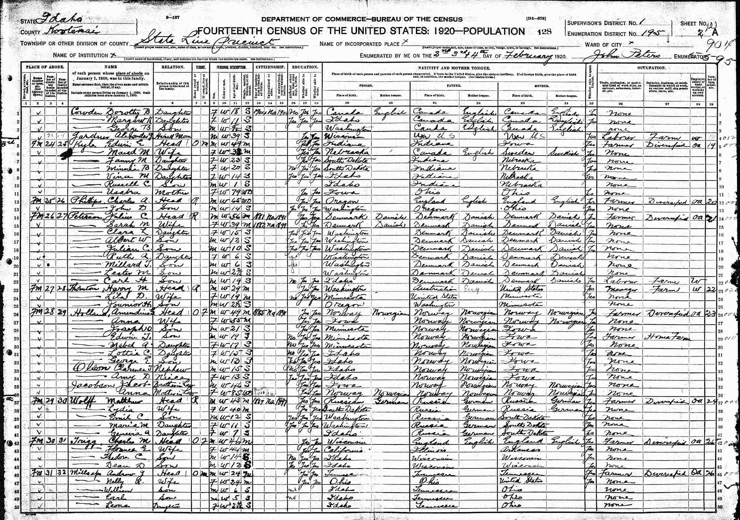 February 2-4, 1920 - Supervisor's District 1, Enumeration District 195, State Line Precinct, Kootenai County, Idaho.