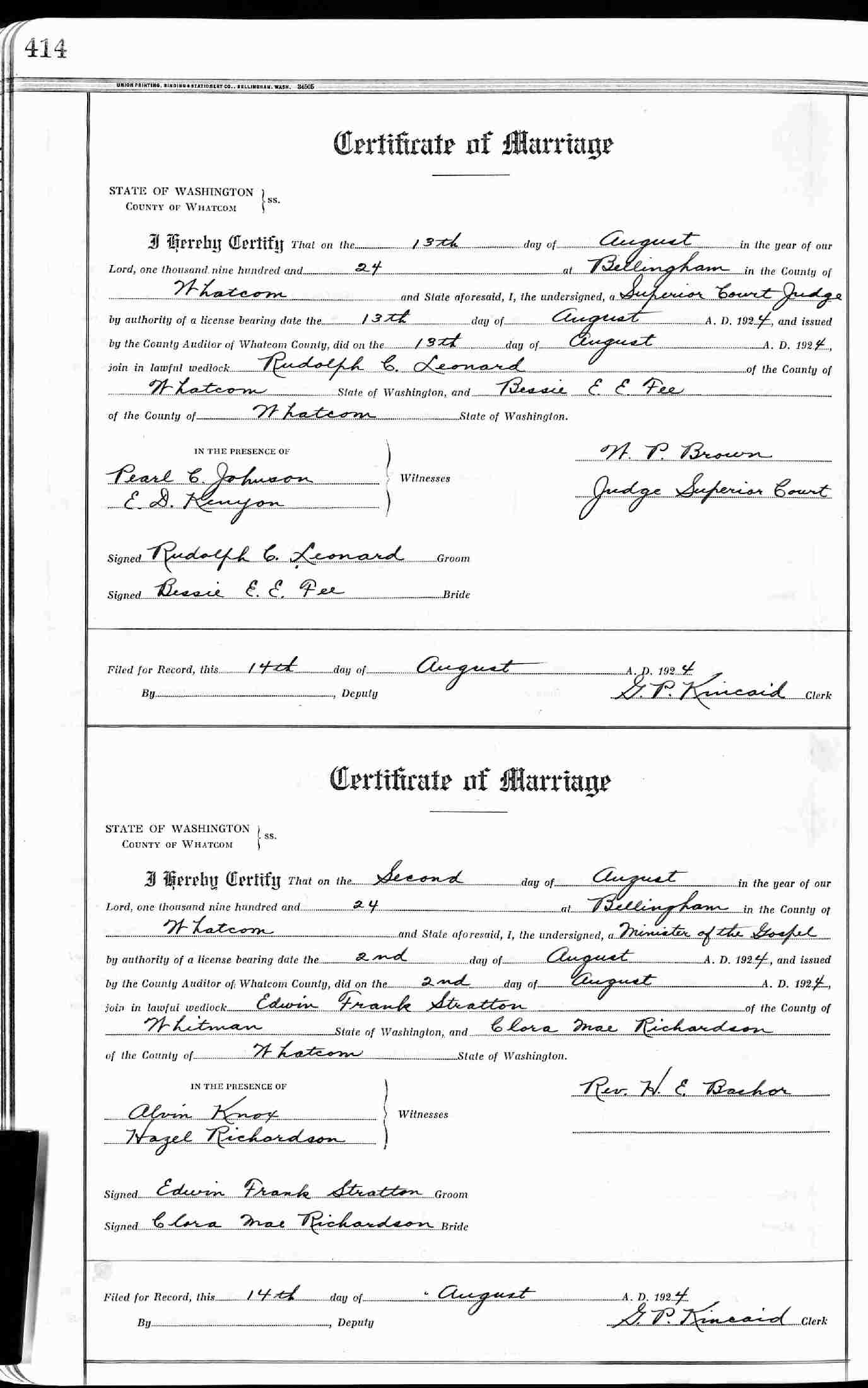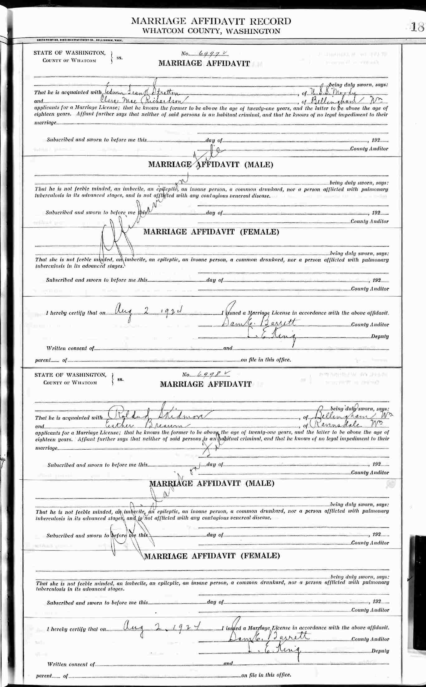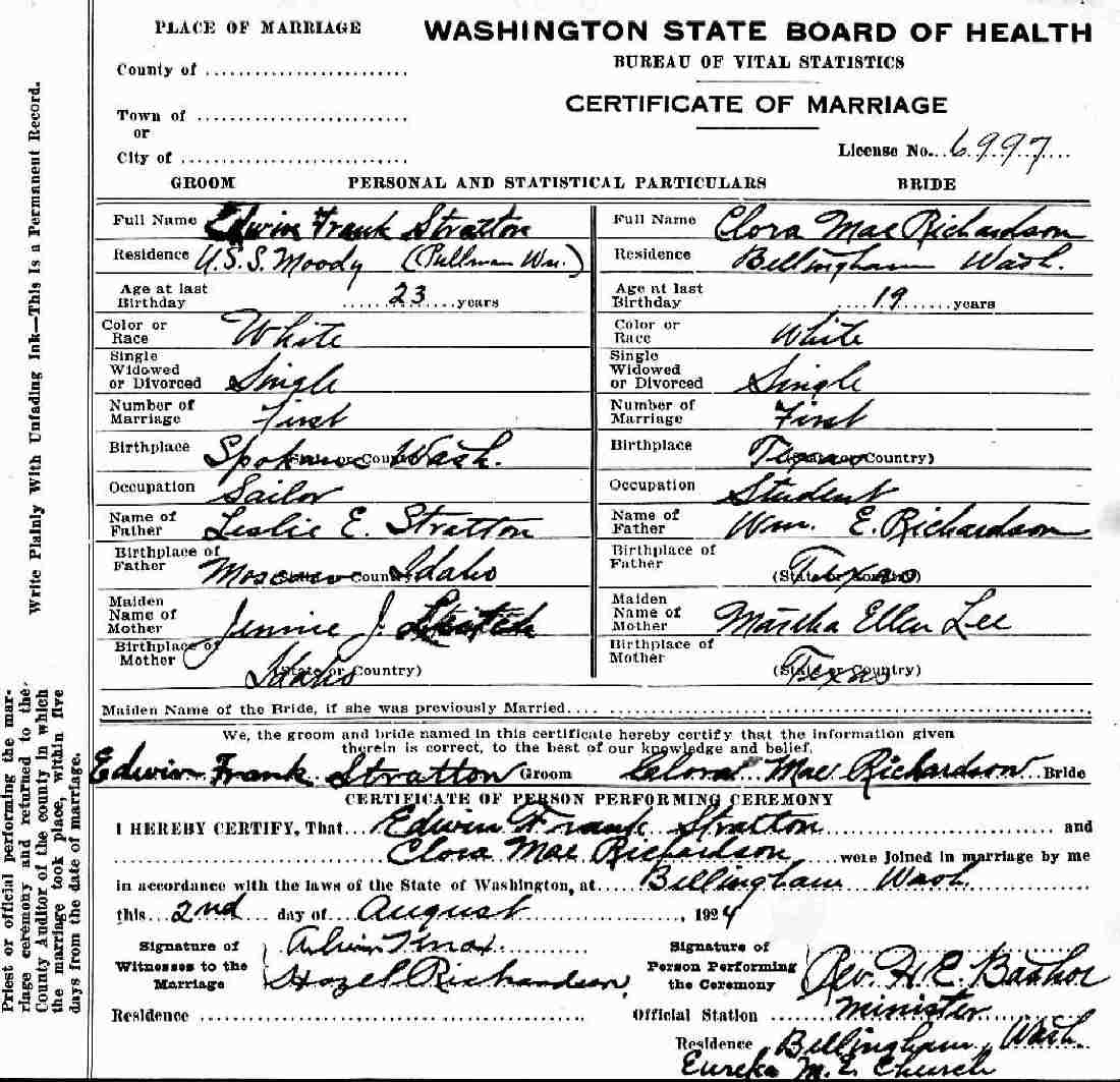 Married: Clora Mae Richardson August 2, 1924 in Bellingham, Whatcom County, Washington.