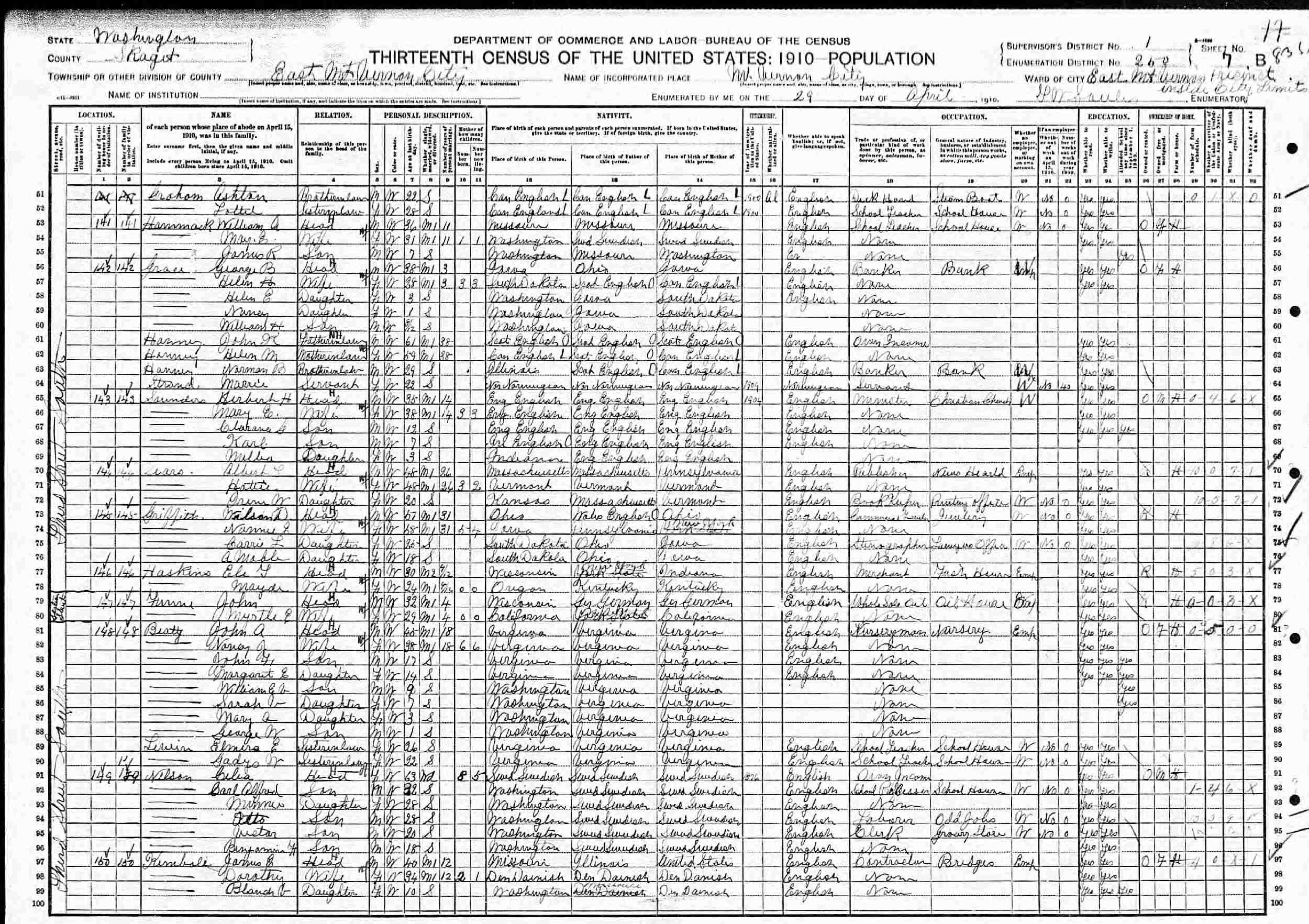 April 29, 1910 - 3rd Street South, Supervisor's District 1, Enumeration District 258, East Mt. Vernon, Skagit County, Washington.