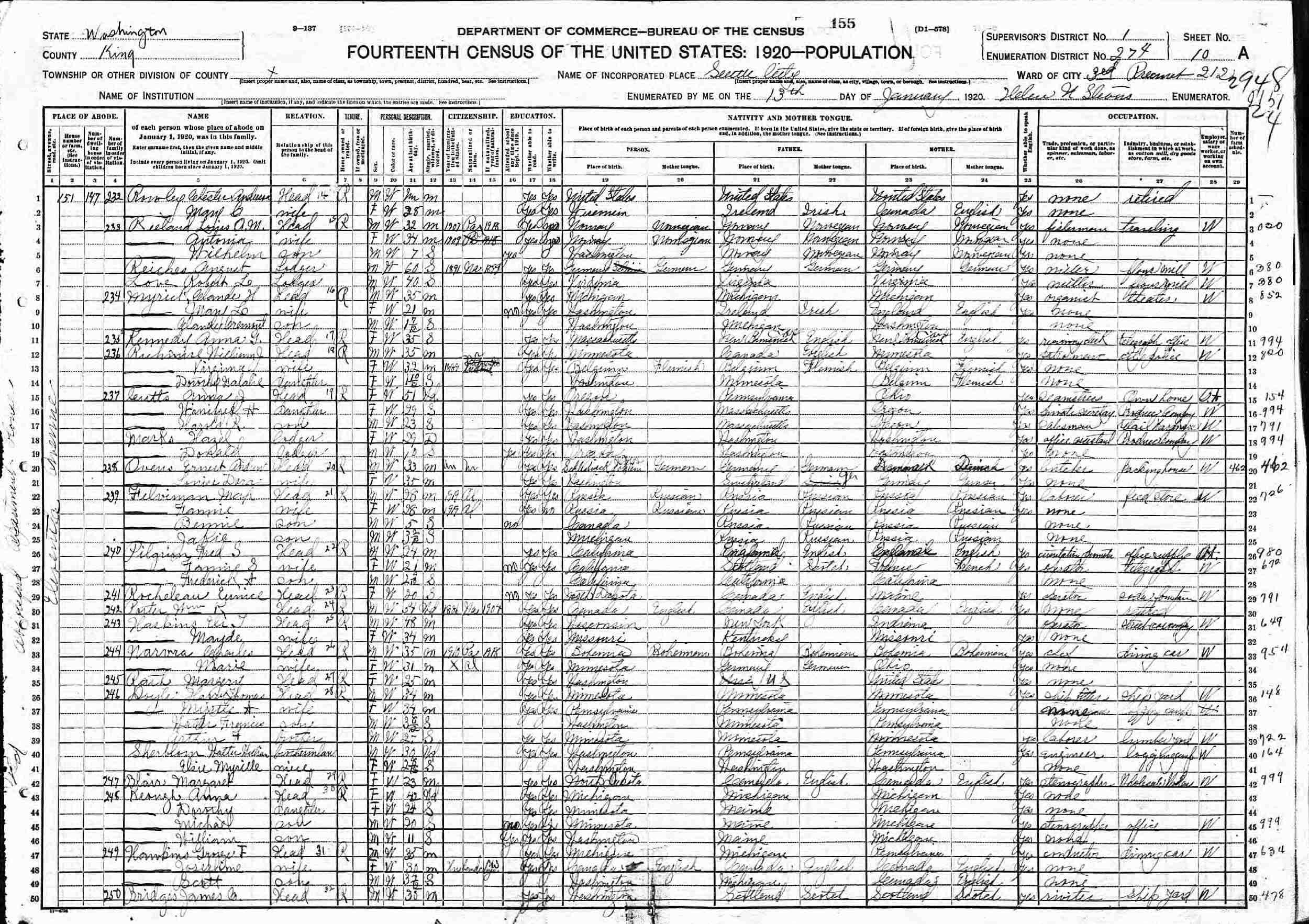 January 13, 1920 - 151 Eleventh Avenue, Ward 3, Precinct 212, Supervisor's District 1, Enumeration District 274, Seattle, King County, Washington.
