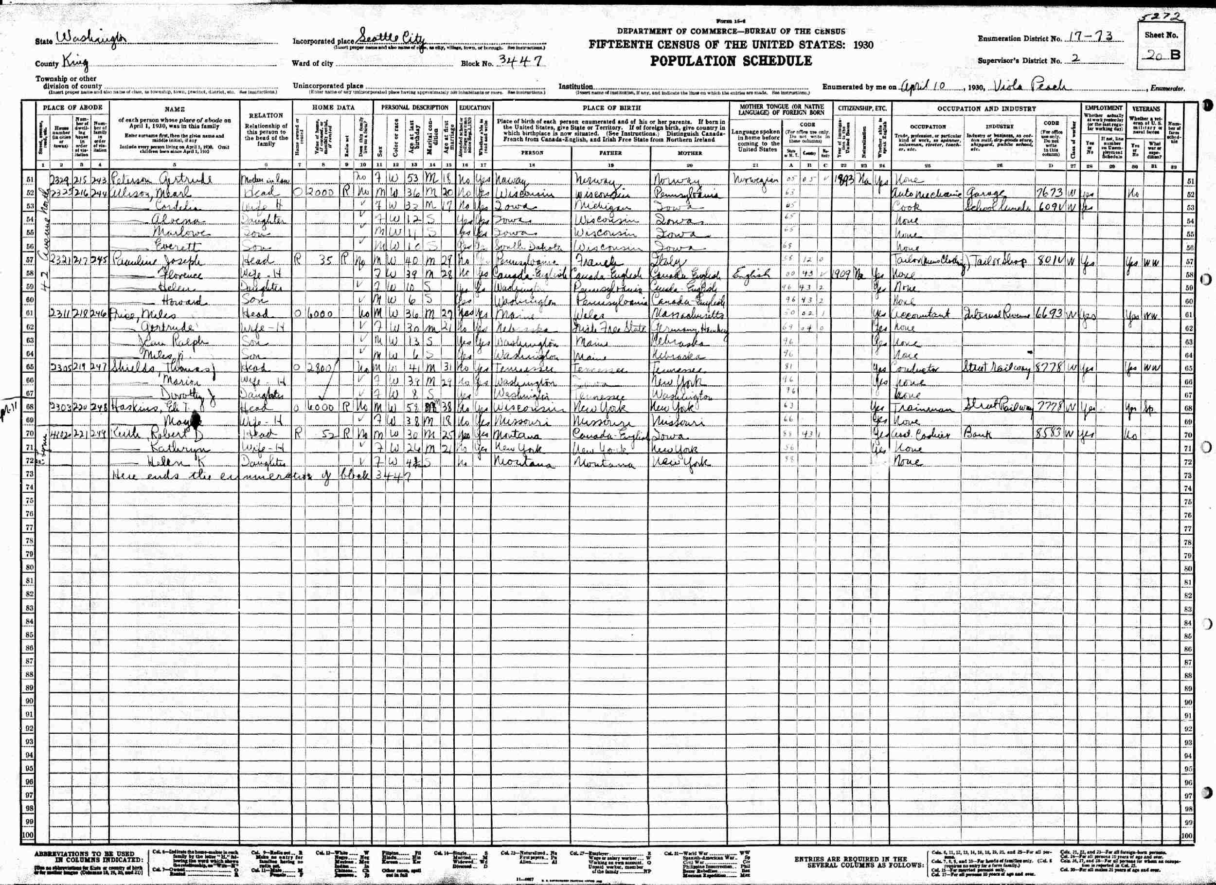 April 10-11, 1930 - 2303 42nd Avenue North, Block 3447, Supervisor's District 2, Enumeration District 17-73, Seattle, Kings County, Washington.