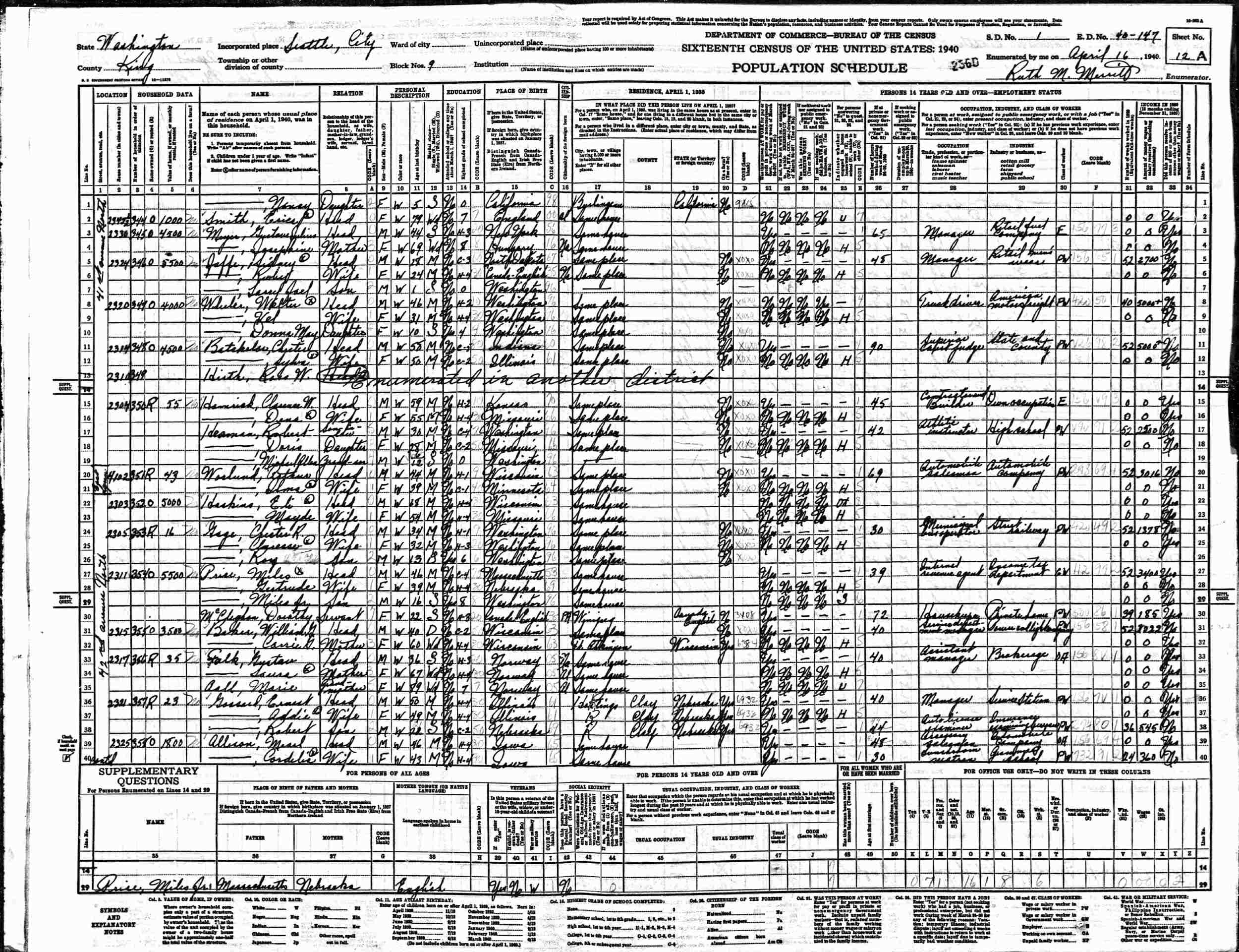 April 16, 1940 - 2303 42nd Avenue North, Block 9, Supervisor's District 1, Enumeration District 40-147, Seattle, Kings County, Washington.