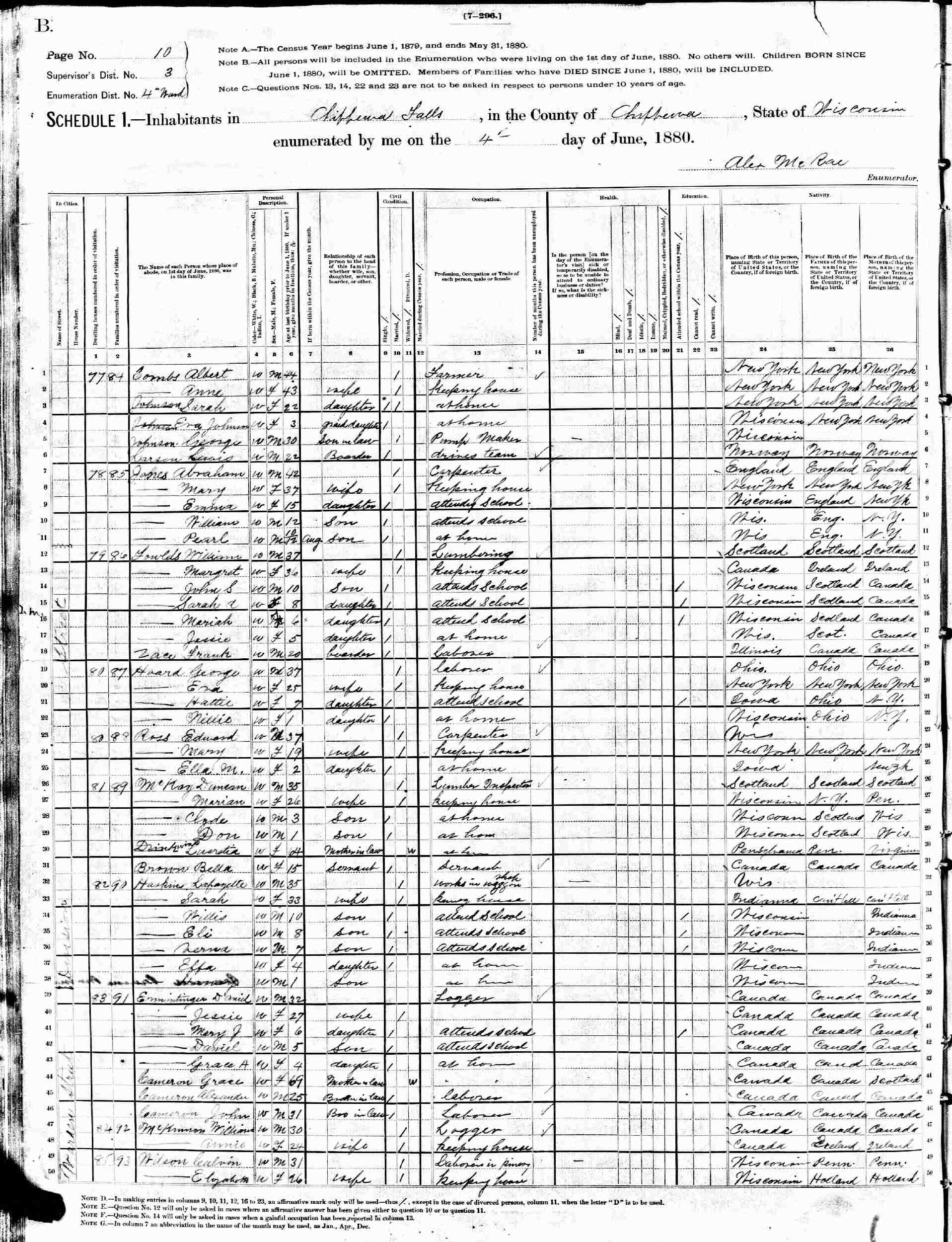 June 4, 1880 - Division Street, Supervisor's District 3, Enumeration District 4, Chippewa Falls, Chippewa County, Wisconsin.