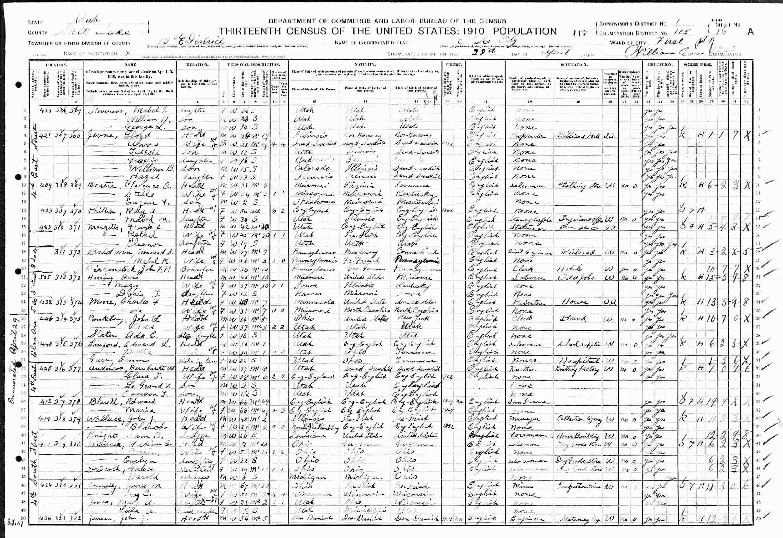 April 28-29, 1910 - 425 4th East, District 12, Ward 1, Supervisor's District 1, Enumeration 105, Salt Lake City, Salt Lake County, Utah.
