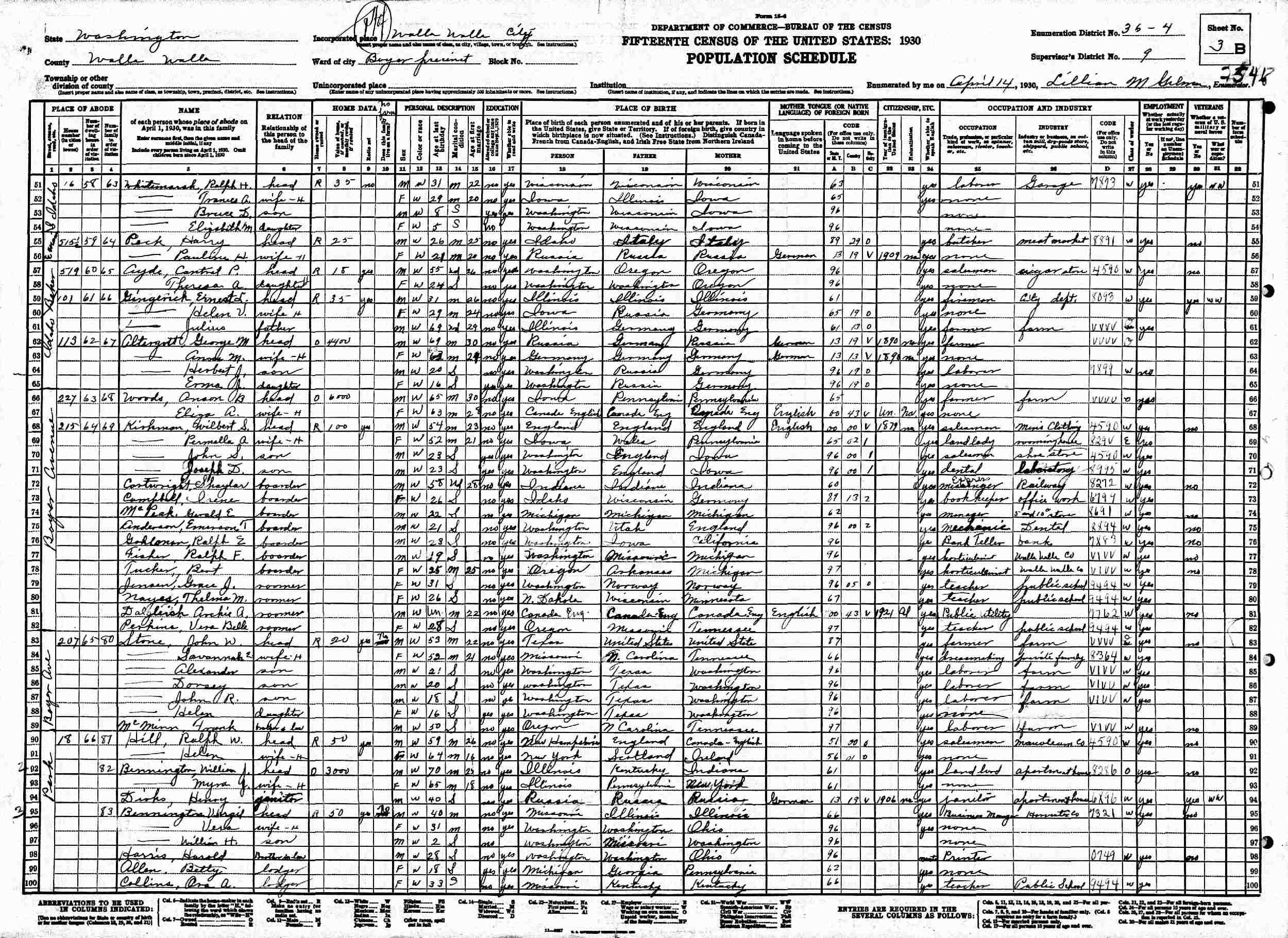 April 14, 1930 - 315 Boyer Avenue, Supervisor's District 9, Enumeration District 36-4, Boyer Precinct, Walla Walla, Walla Walla County, Washington (Boarder).