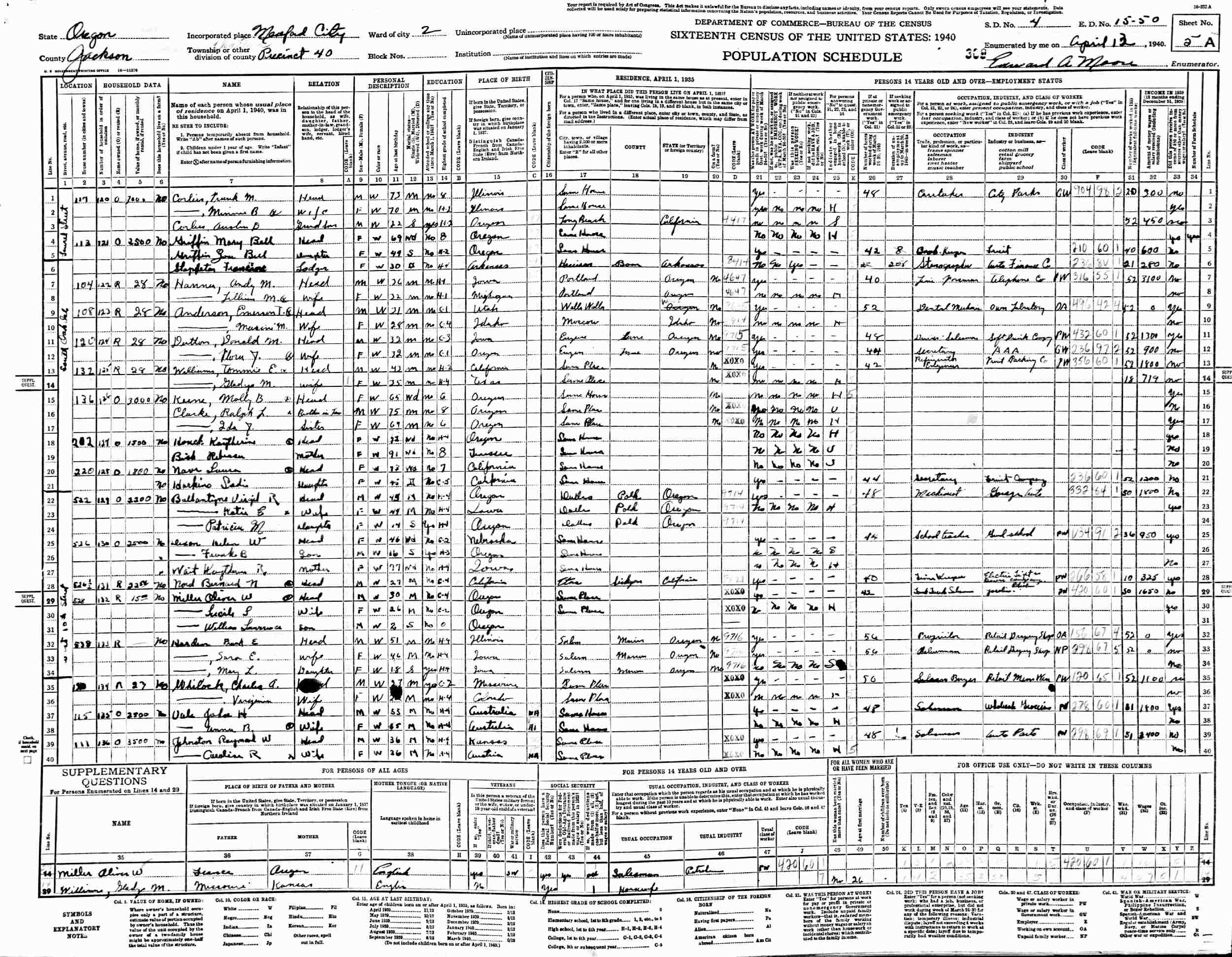 April 13, 1940 - 108 South Oak Street, Precinct 40, Ward 2, Supervisor's District 4, Enumeration District 15-50, Medford City, Jackson County, Oregon.