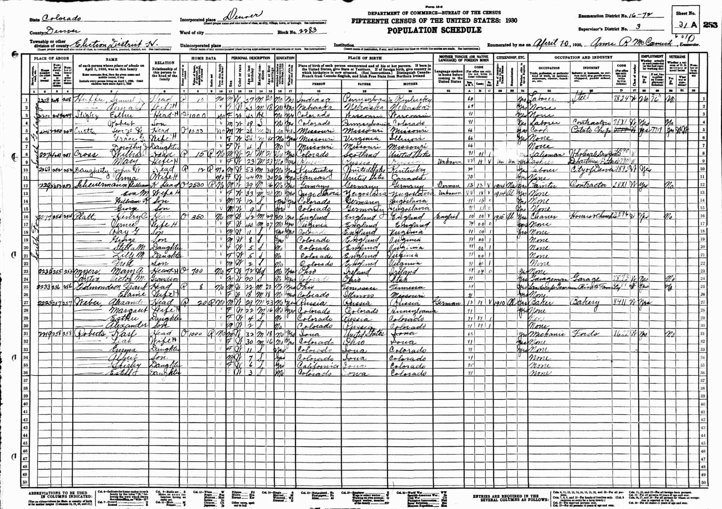 April 10, 1930 - 2200 South Galapago, Election District H, Block 2283, Supervisor's District 3, Enumeration District 16-72, Denver, Denver County, Colorado. (Listed as Widowed but was divorced.)