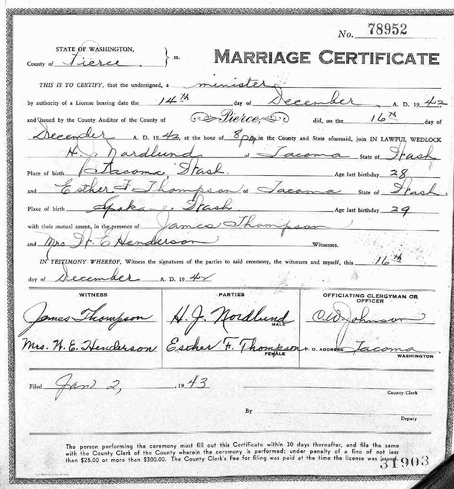 Married: Herbert J Nordlund December 16, 1942 in Pierce County, Washington.
