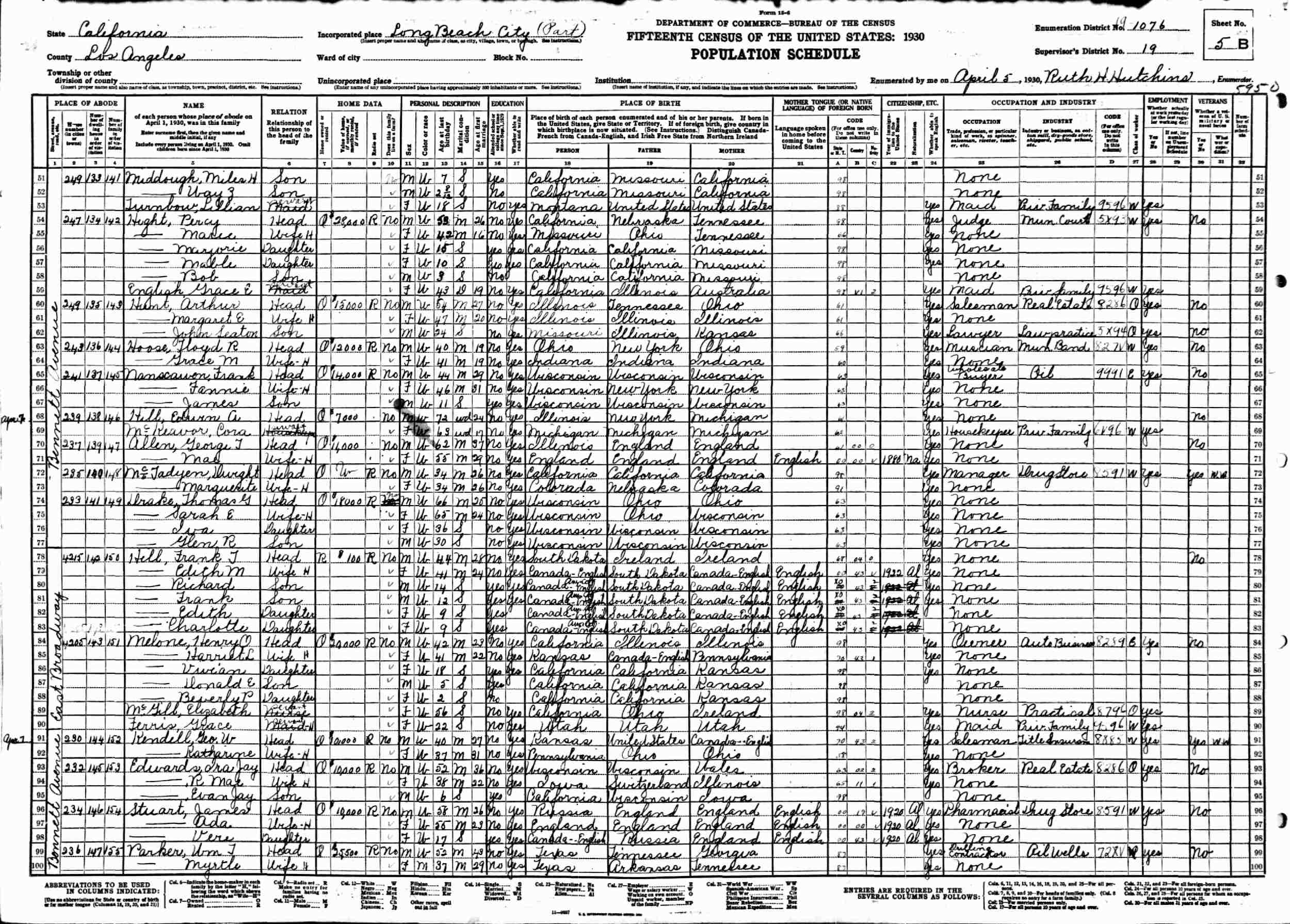 April 5, 1930 - 341 Bennett Avenue, Supervisor's District 19, Enumeration District 19-1076, Long Beach, Los Angeles County, California.