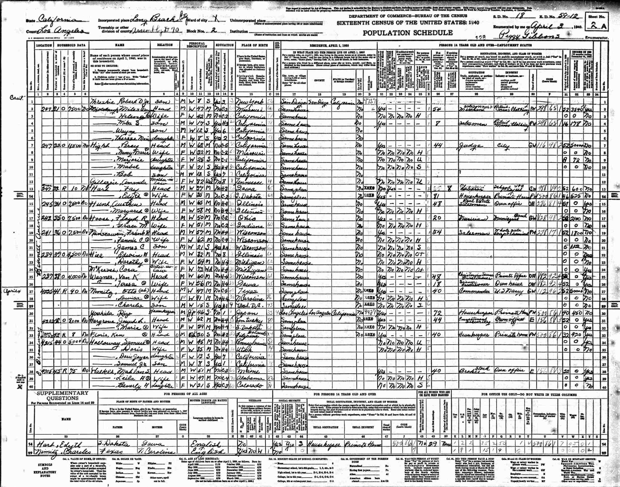 April 3, 1940 - 341 Bennett Avenue, Assembly District 70, Block 2, Supervisor's District 18, Enumeration District 59-12,Long Beach, Los Angeles County, California.