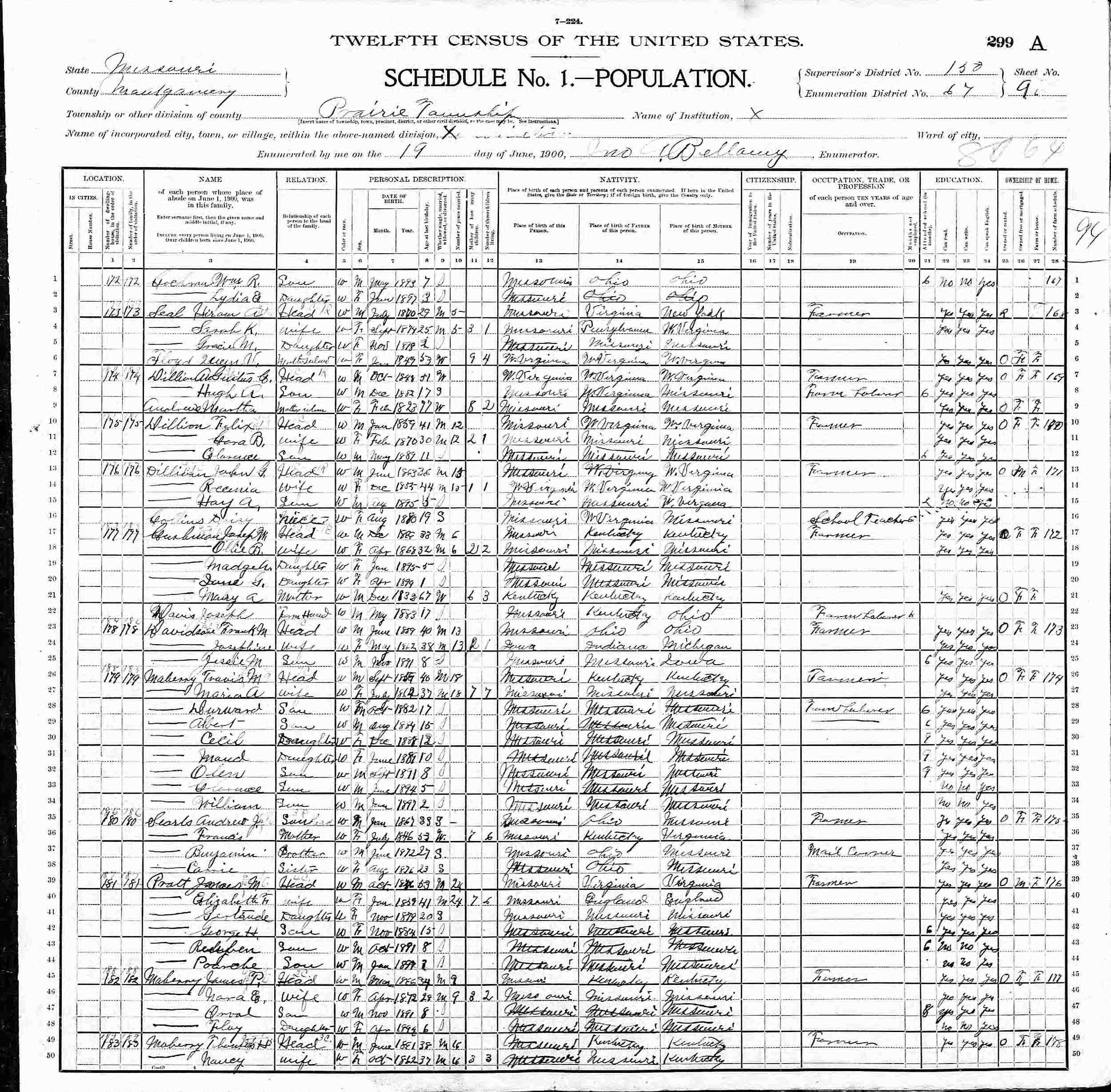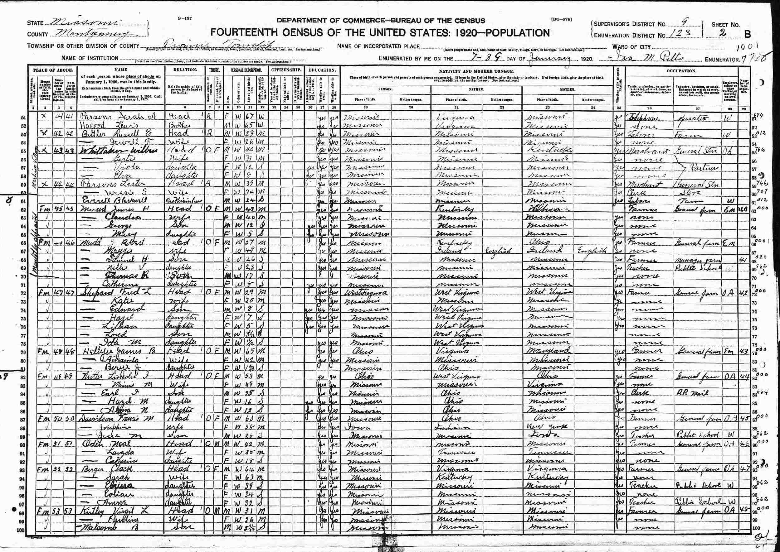 January 7-9, 1920 - Supervisor's District 9, Enumeration District 123, Prairie Township, Montgomery County, Missouri.