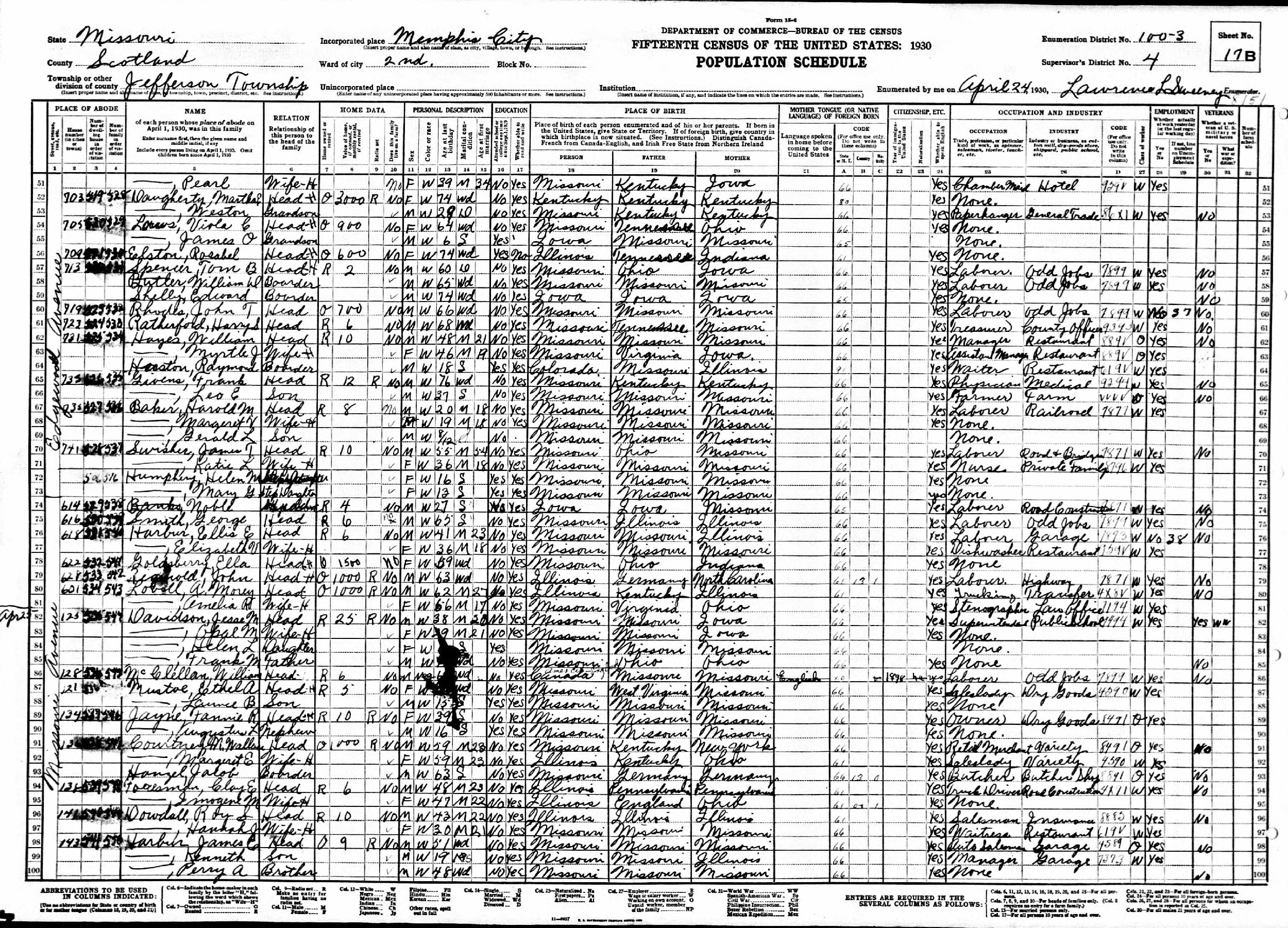 April 24-25, 1930 - 125 Missouri Avenue, Ward 2, Supervisor's District 4, Enumeration District 100-3, Memphis City, Jefferson Township, Scotland County, Missouri (w/son and daughter-in-law, Jesse and Opal).