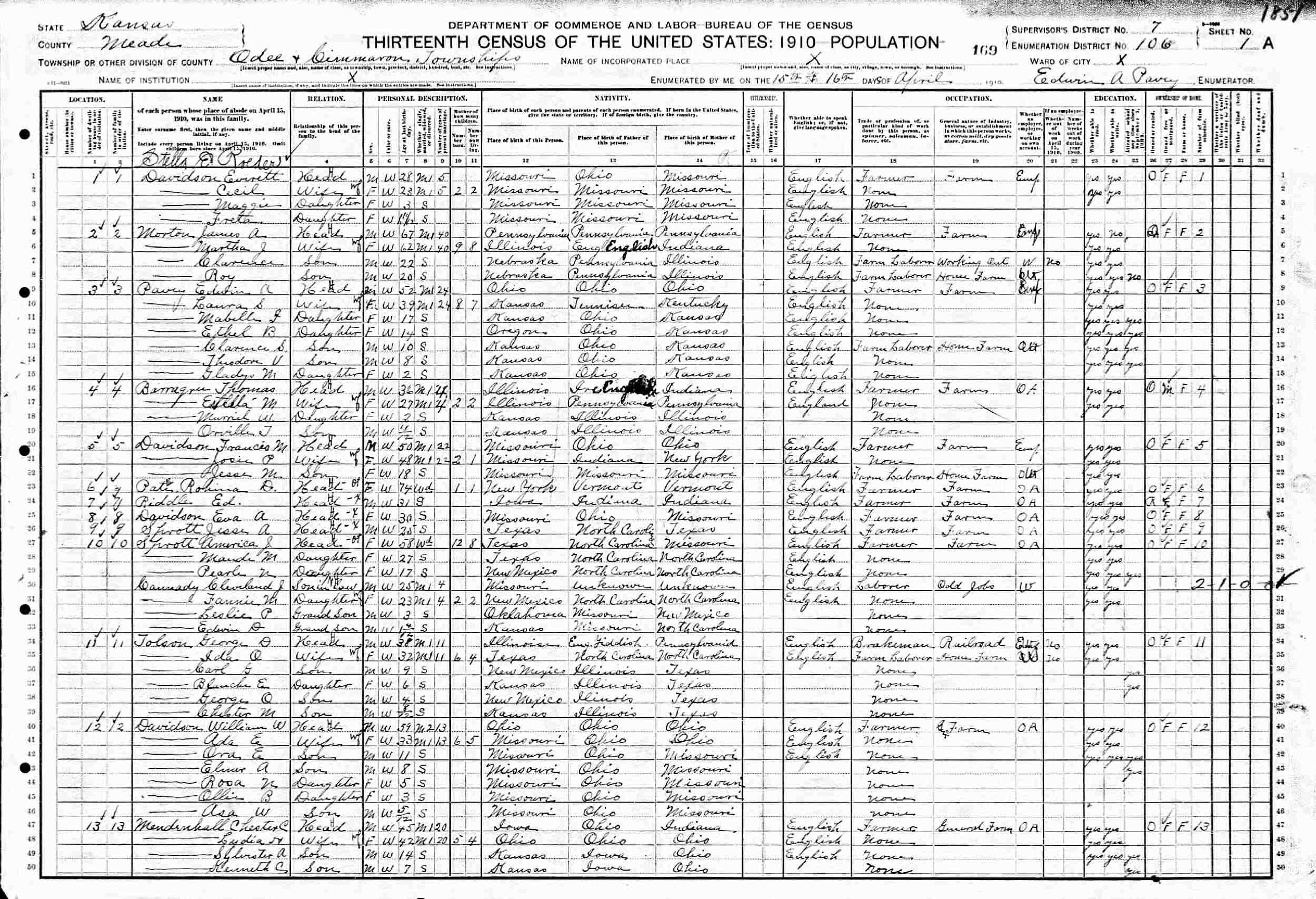 April 15-16, 1910 - Supervisor's District 7, Enumeration District 106, Odee and Cimmaron Townships, Meade County, Kansas.
